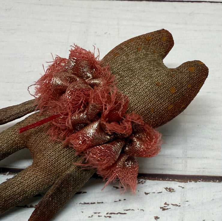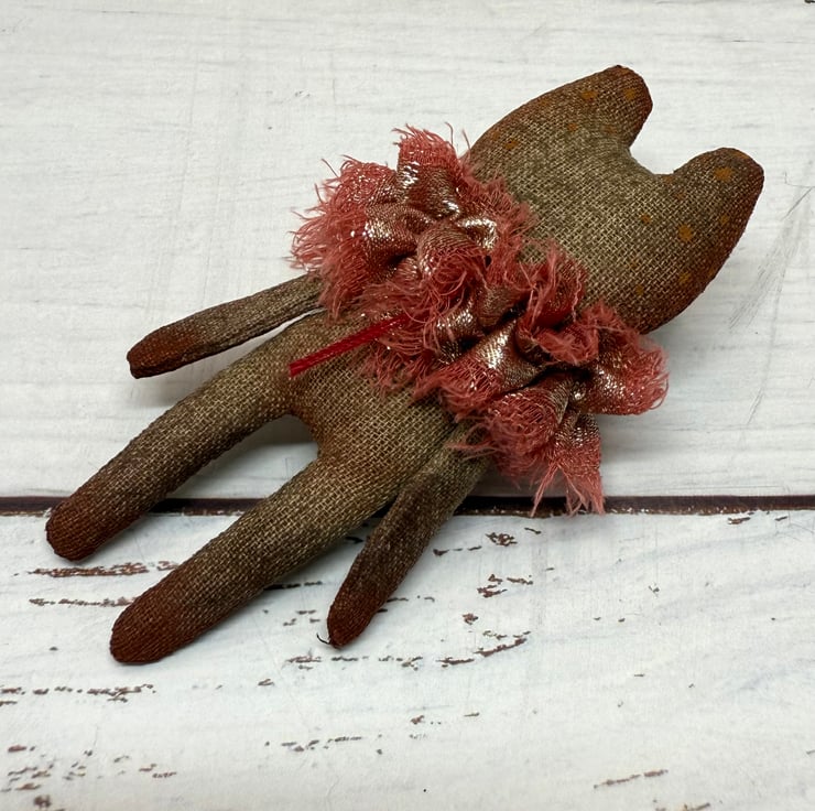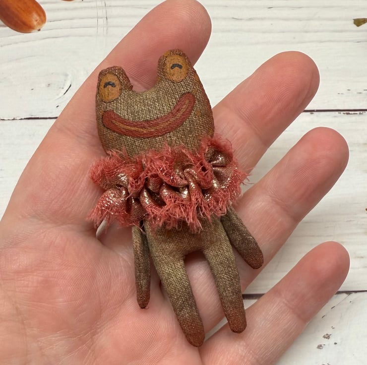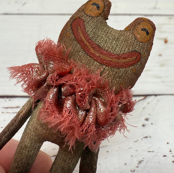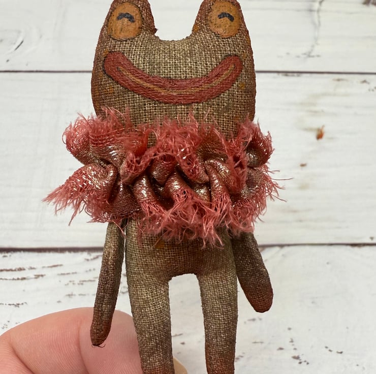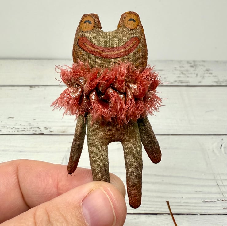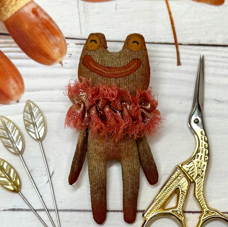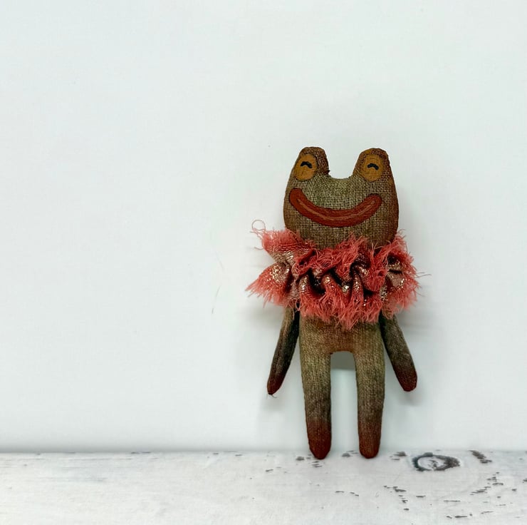 This one of a kind little frog is a stuffed cotton doll entirely hand painted with speckles. Frog wears metallic gold flecked chiffon ruffle around the neck. Frog measures roughly 7.5cm tall and comes in recycled or recyclable packaging. This is for decorative purposes only and not a toy. If you’d like a hanger please choose from the option.