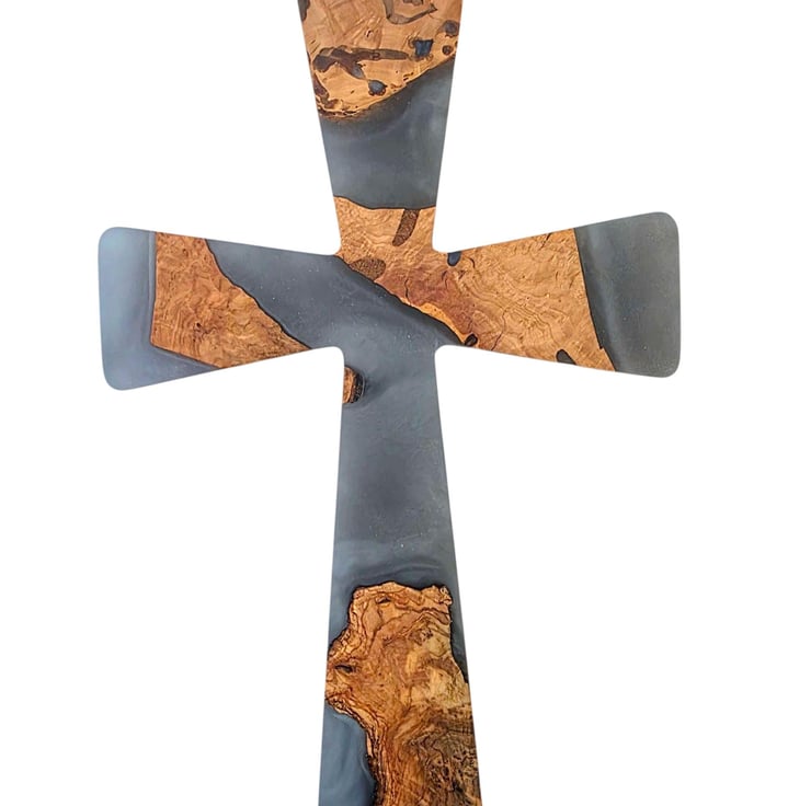 A unique blend of tradition and artistry this handcrafted olive wood cross features stunning resin art, making it a heartfelt gift for any spiritual milestone or special occasion.