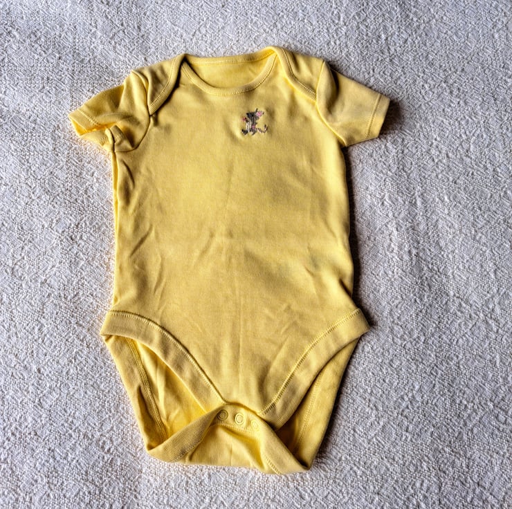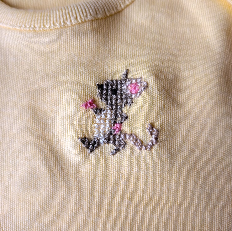 I have hand embroidered a small brown mouse on the left side of this lovely yellow baby vest/onesie. As I never use a permanent backing fabric when stitching kids' clothing, there is nothing inside to irritate your child's skin. The vest has an envelope neck, short sleeves and three press studs between the leg openings. It is all cotton and can be machine washed.