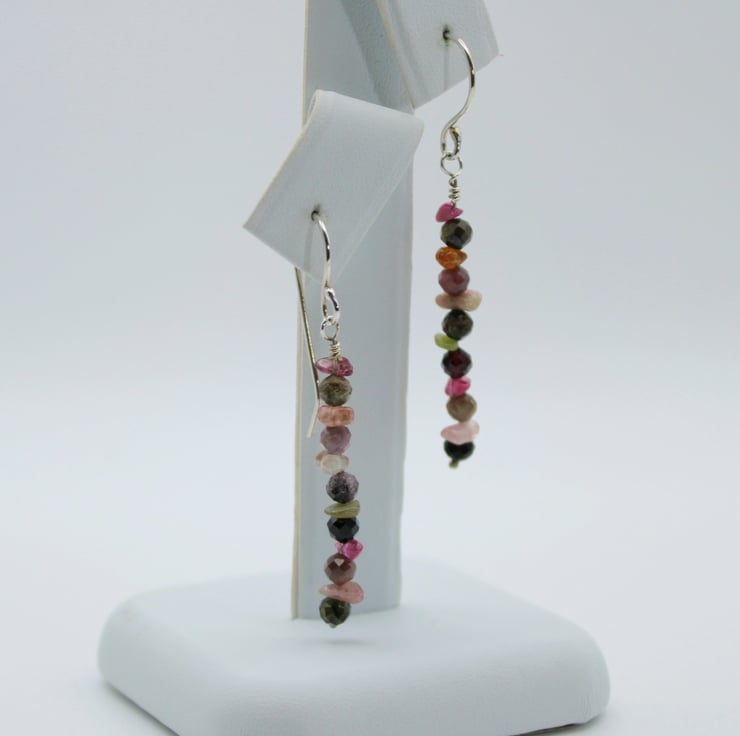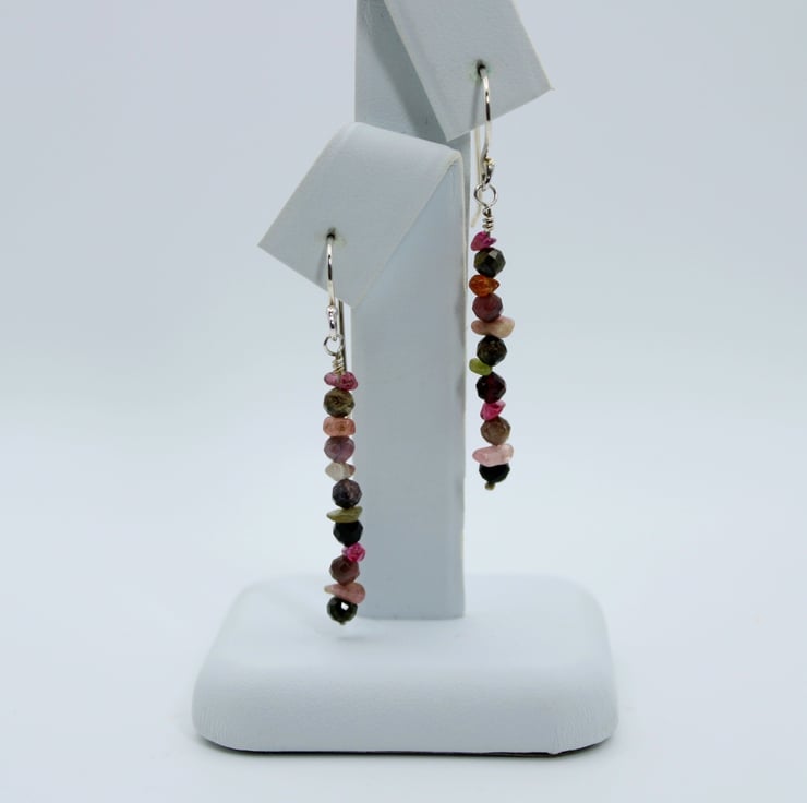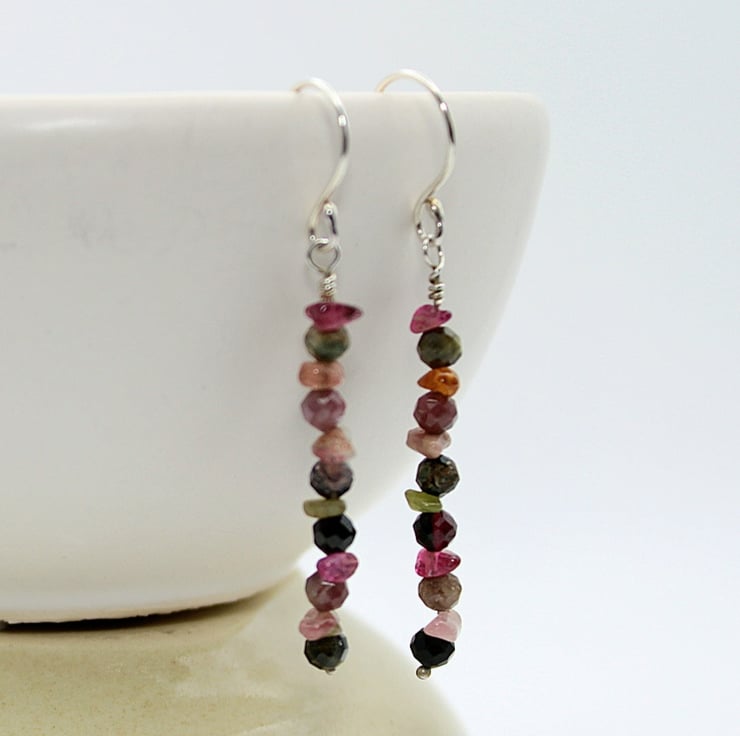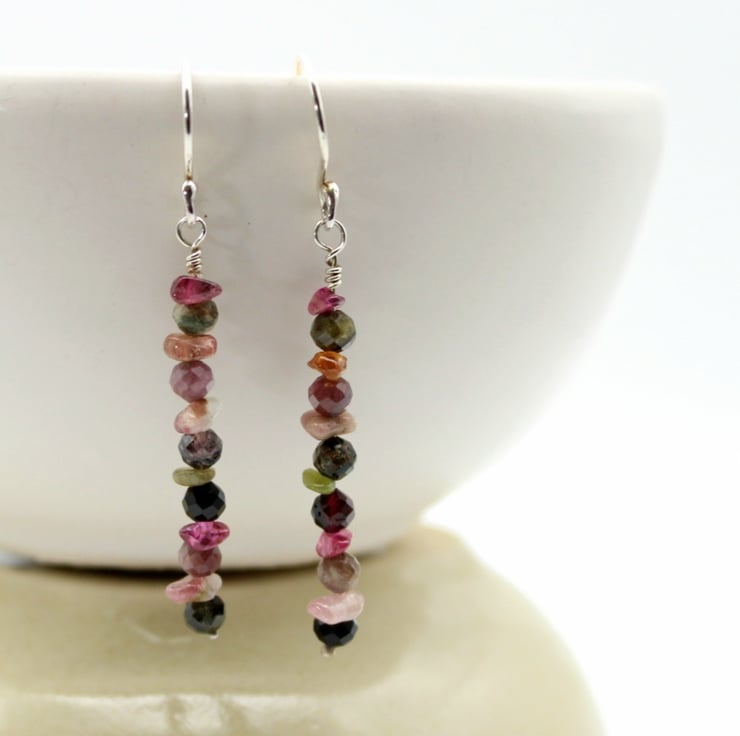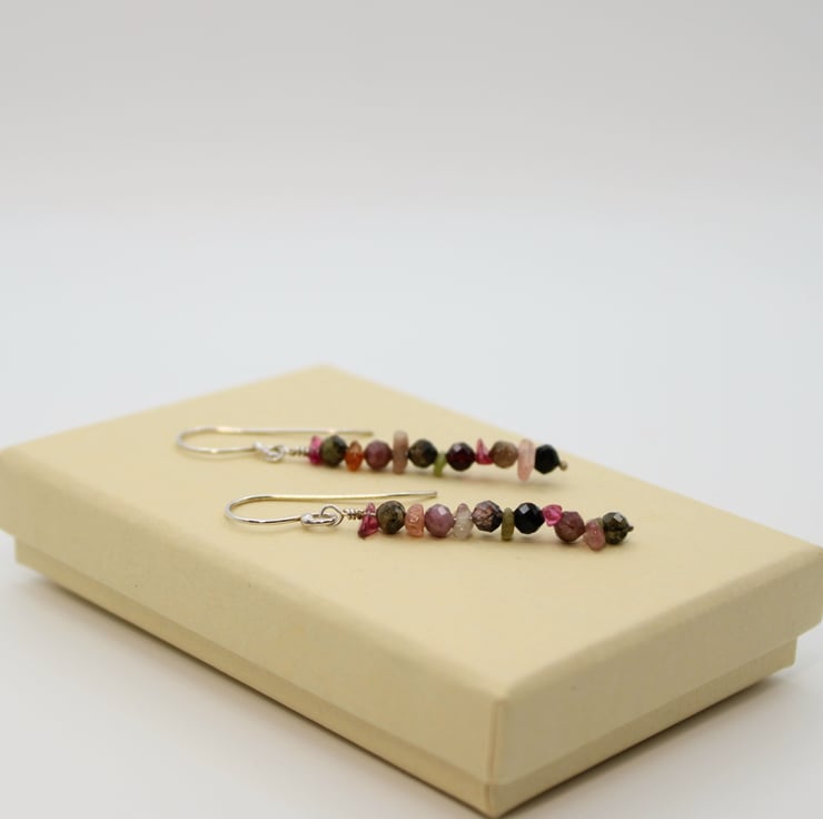 These delicate earrings have been inspired by the lovely Autumn colours that are beginning to appear. They have been created using the gorgeous multiple colours of the gemstone Tourmaline using both chips and small sparkly faceted Tourmaline beads to give texture and reflect eye catching light. The earrings have green, pink and plum coloured hues perfect to welcome in Autumn.