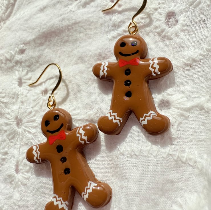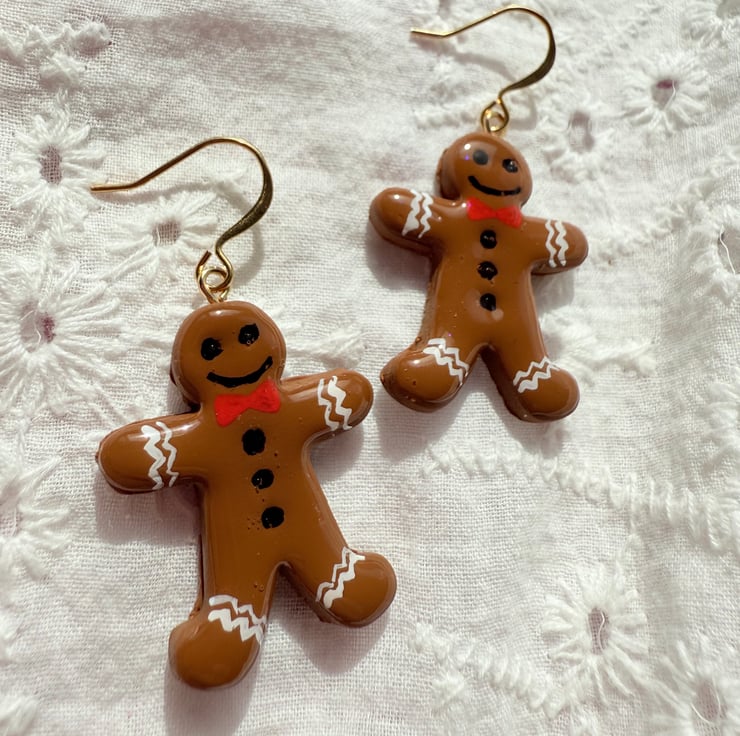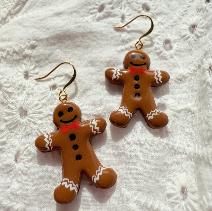 These earrings feature hand-painted gingerbread man charms with red bow ties and white icing details.