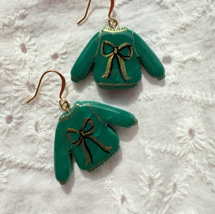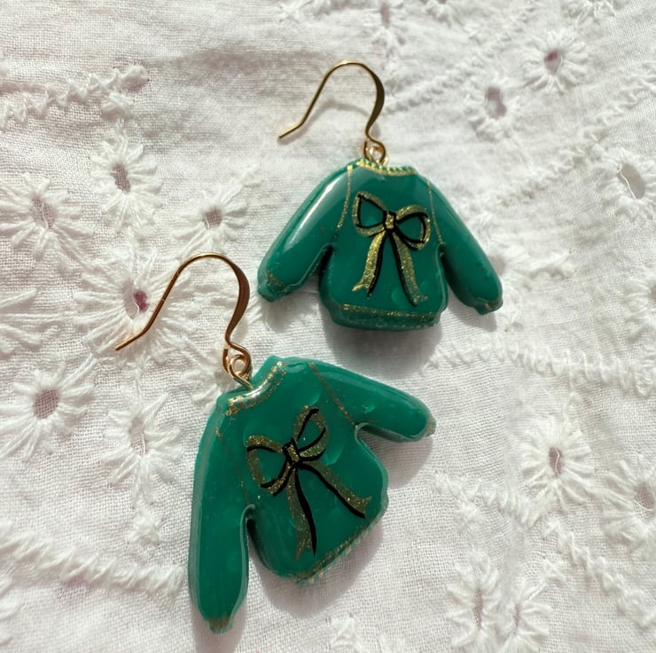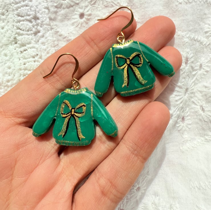 These earrings feature hand-painted green sweater charms decorated with gold bows. Lightweight and festive, they hang from gold plated hooks and are a fun seasonal accessory for the holidays.