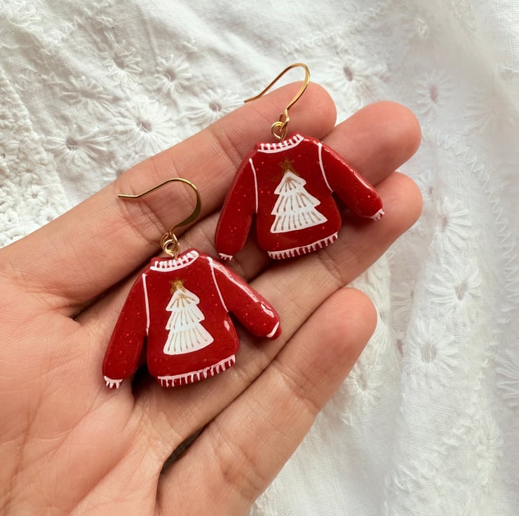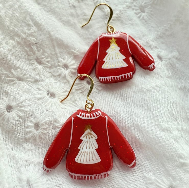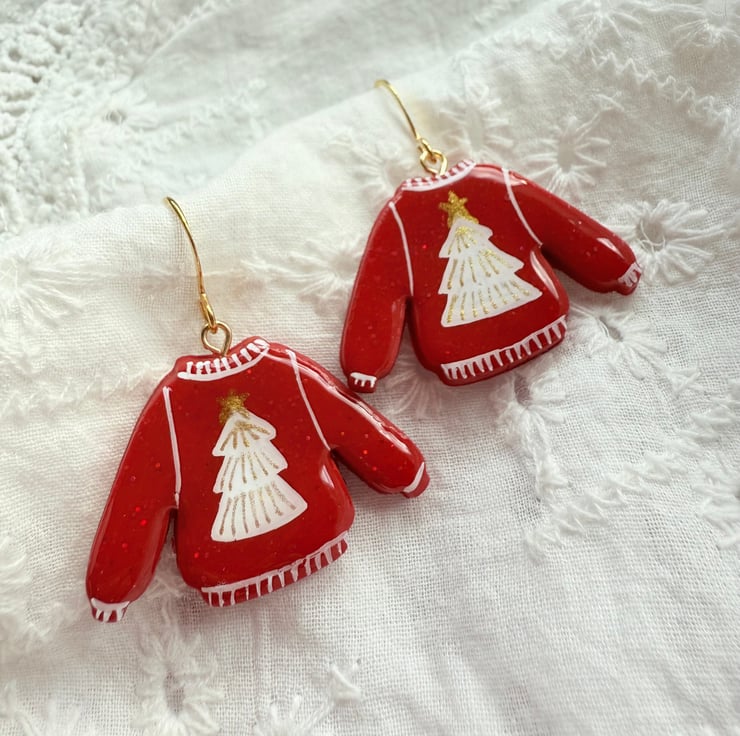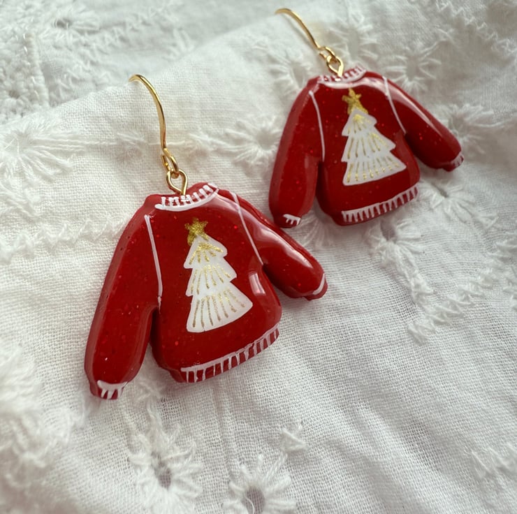 These earrings feature hand-painted red sweater charms with white Christmas tree details topped with a gold star.