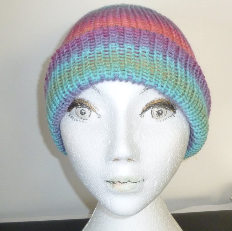 this pretty rainbow coloured hat has been knitted to fit an average size adult head.