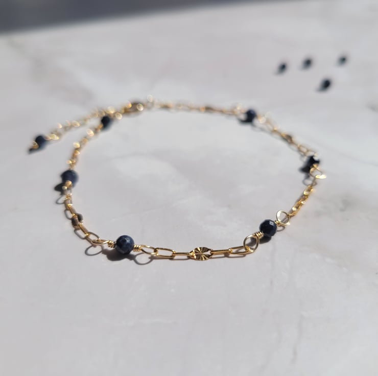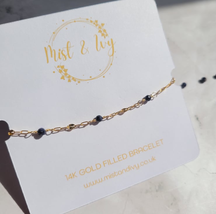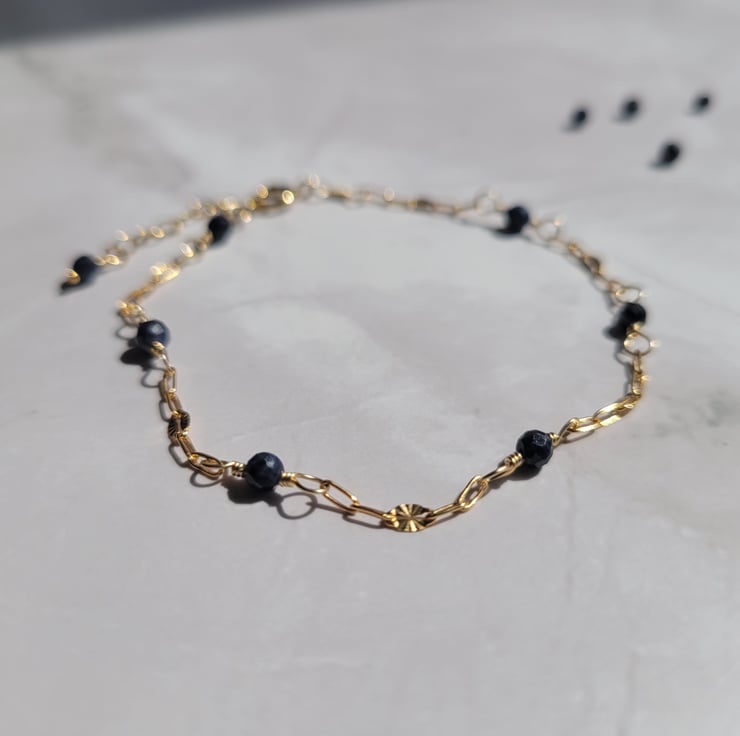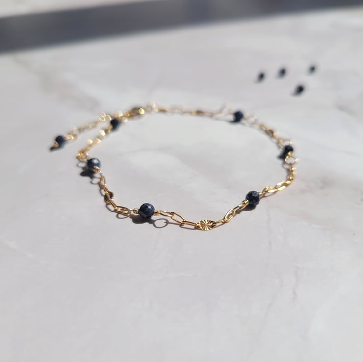 This delicate sapphire chain bracelet is handmade with sapphire gemstone beads which have been wire wrapped with care onto a beautiful starburst style chain. The bracelet is 14kt gold filled and hypoallergenic.