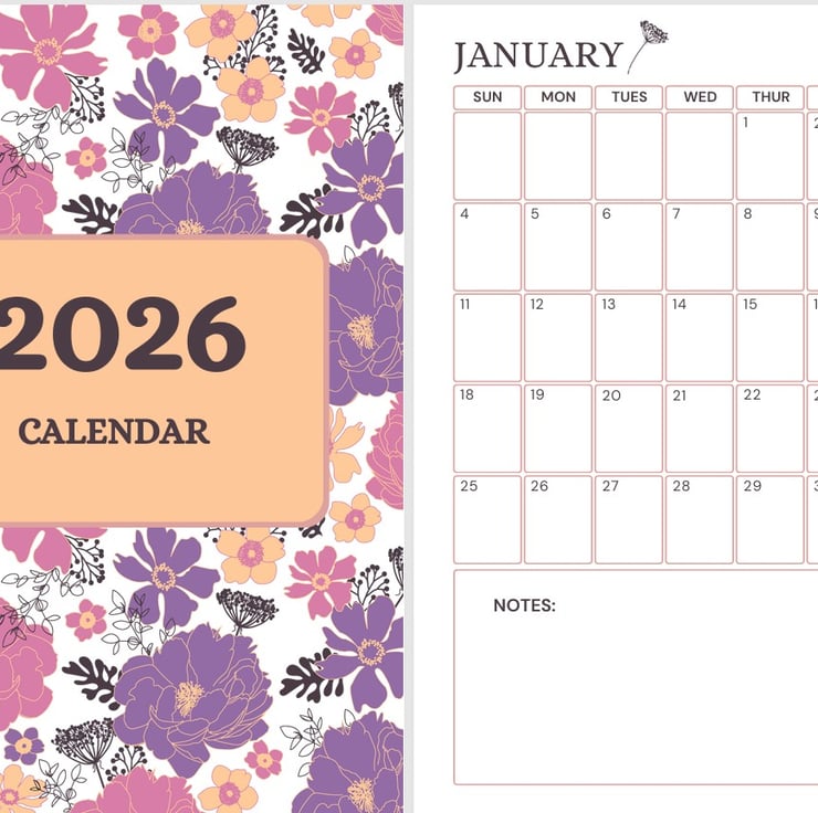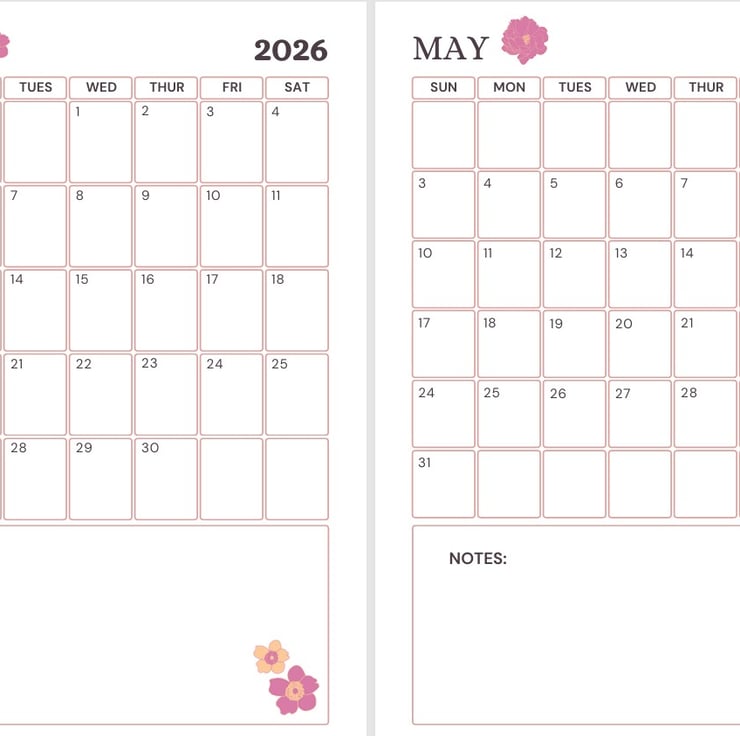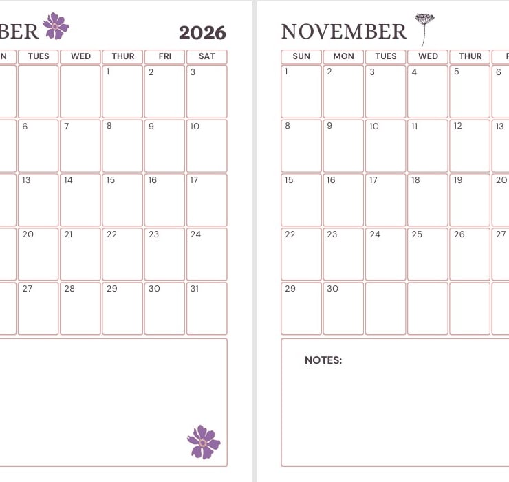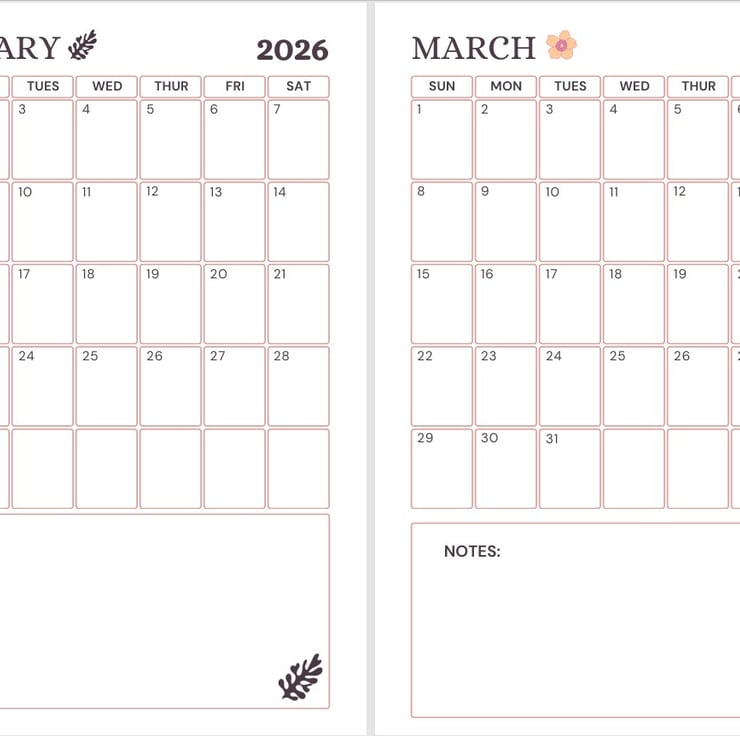 Organise your year ahead with this Modern Flora 2026 Monthly Planner Calendar, PDF printable. Each month page has enough room to add a little note onto each day, as well as extra space for additional notes to organise your month.