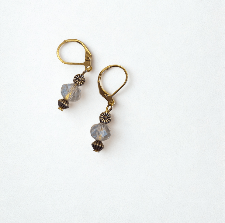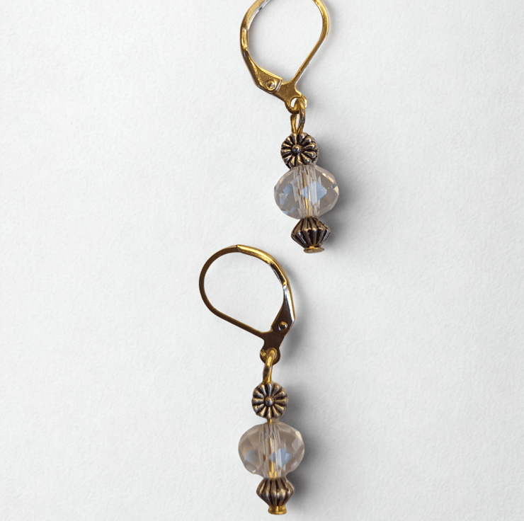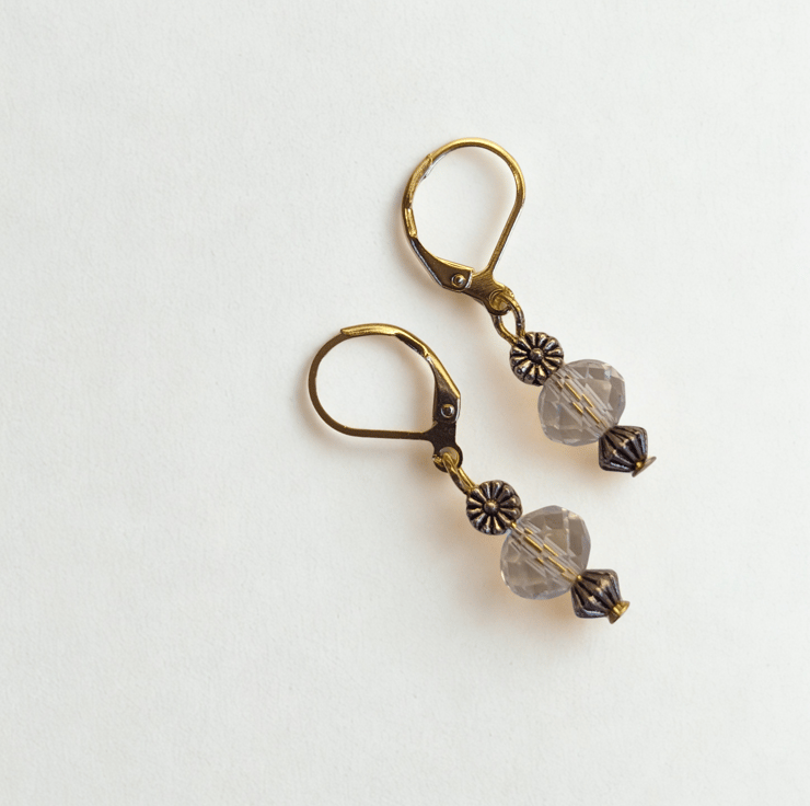 Little recycled faceted sparkly crystal beads blended with decorative Tibetan silver daisies and also antique gold coloured beads. Just a small drop but with a lovely sparkle these earrings are very pretty. Hanging on 24 carat gold plated lever back hook for comfort and security.