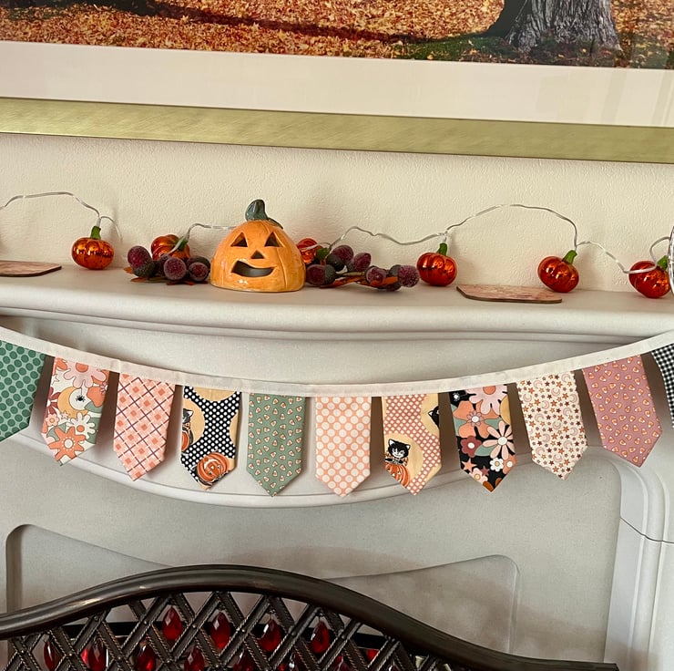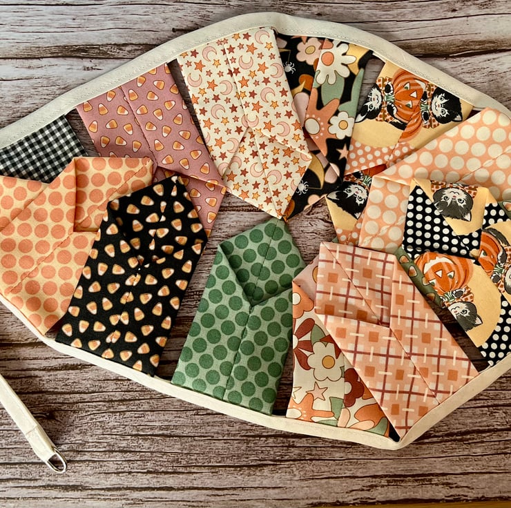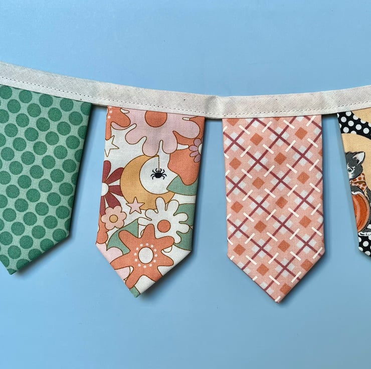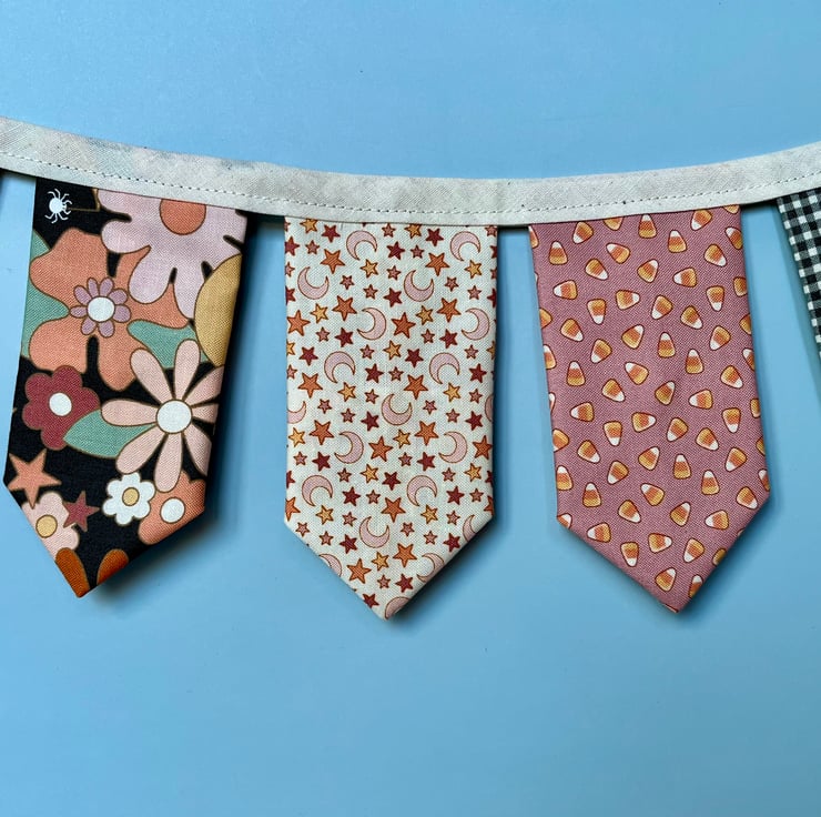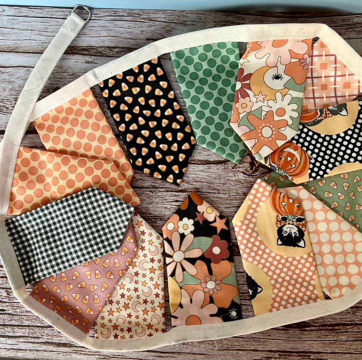 Mini bunting ideal for mantelpiece or office desk. 116cm long with d-rings either end, suitable for hooks. 14 flags each measuring 10cm x 5.5cm. Handmade with cute Halloween theme.