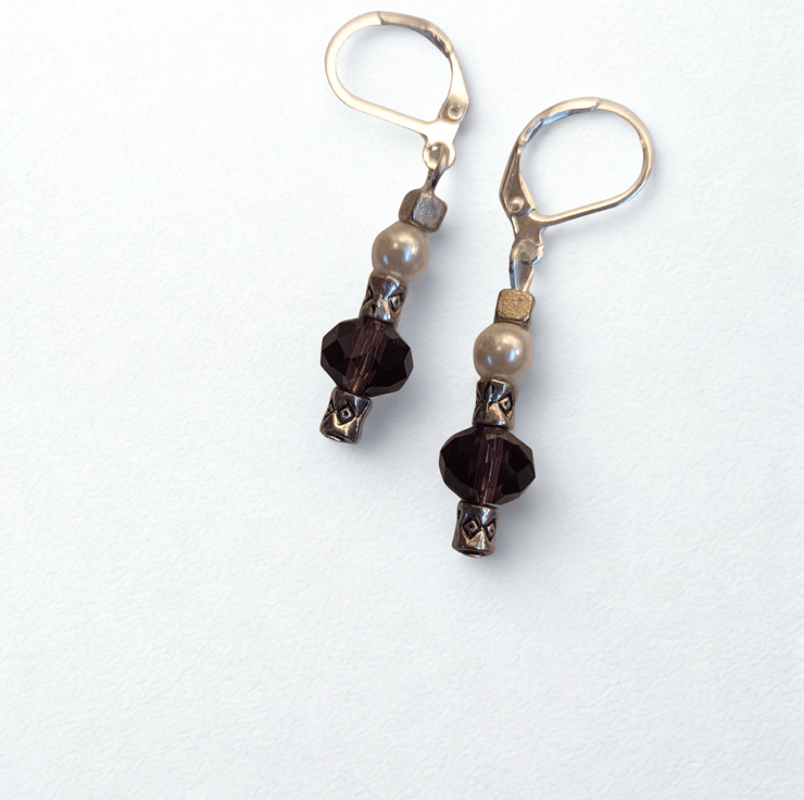 Recycled deep purple faceted crystal glass earrings blended with small recycled pearls and decorative Tibetan silver. Hanging on 925 silver lever back hooks.