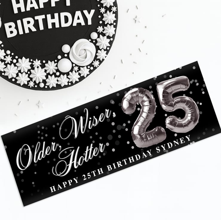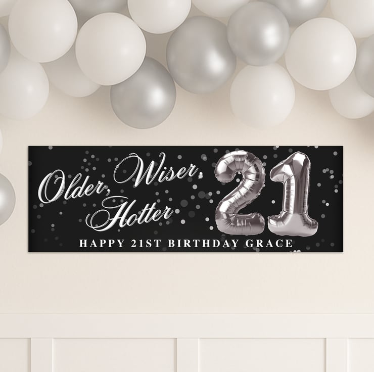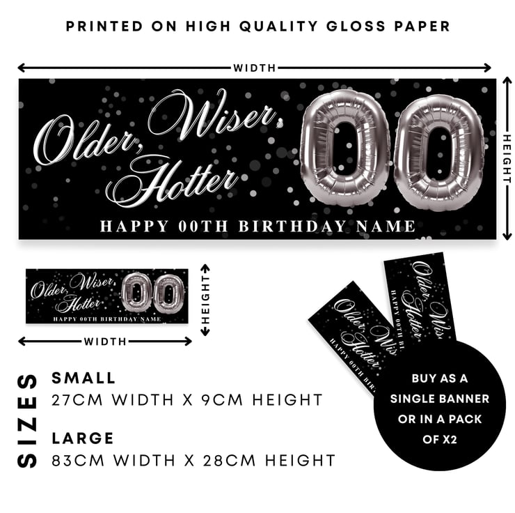Celebrate milestone birthdays in style with this Older, Wiser, Hotter personalised banner. Featuring bold lettering, silver balloon-style numbers and a chic black background, this decoration is perfect for milestone parties. Add any name (up to 8 characters) and age for a truly personal touch. Printed on premium gloss paper, available in two sizes.