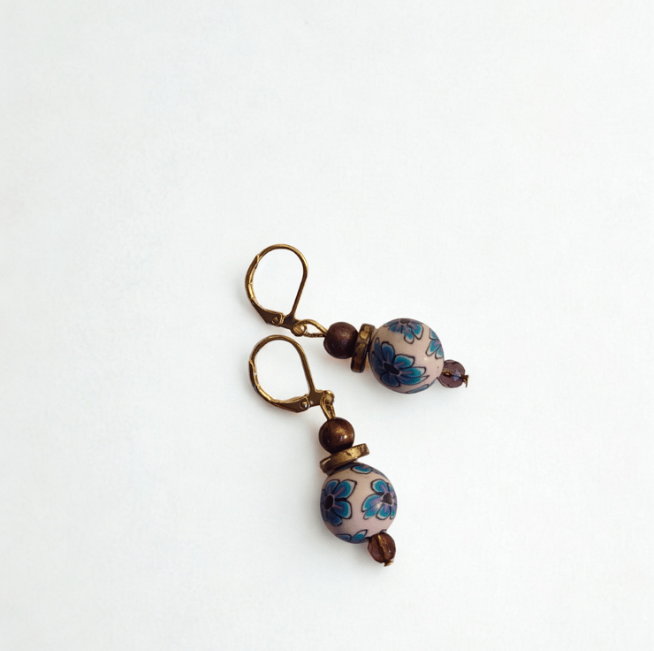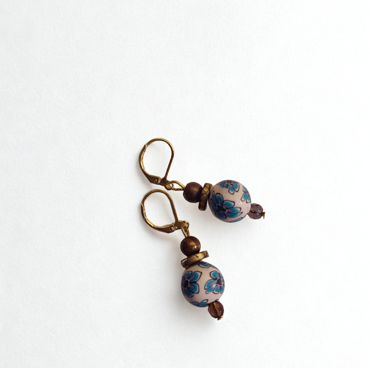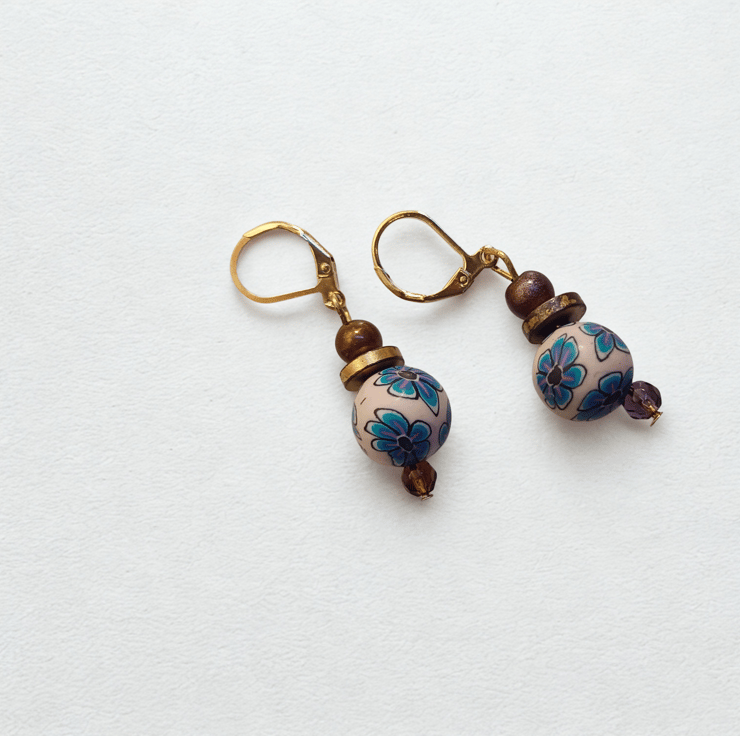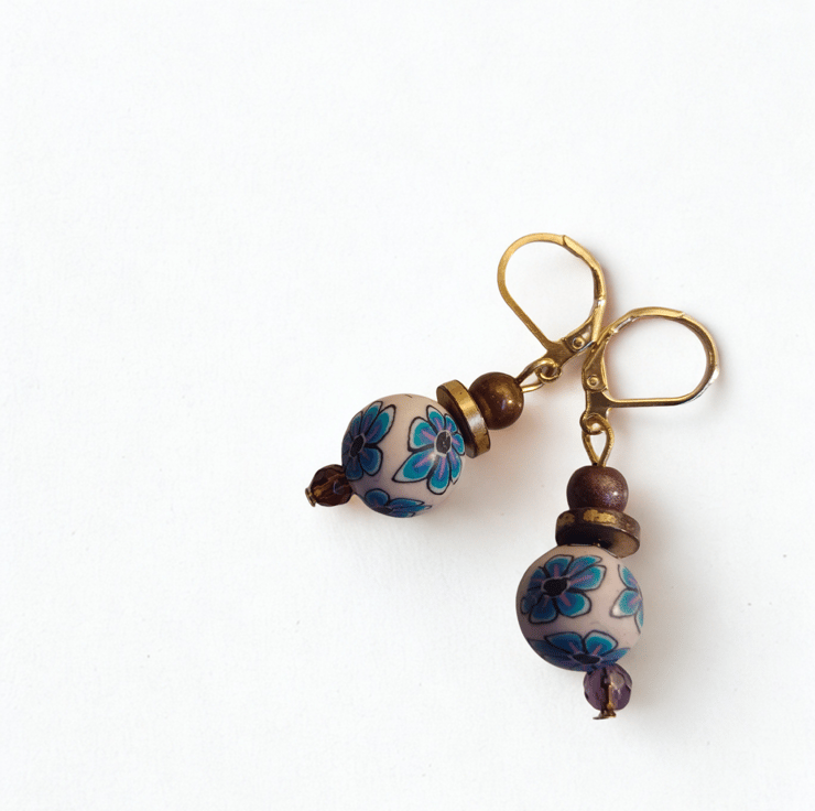 The lightest purple orbs of polymer clay with a very muted floral design in purple, blue and a smidgen of cream. Sitting upon a dark oak coloured glass bead. With a little antique gold disc and a smaller bead in a darker antique gold. Lovely muted subtle colours. On 24 carat gold plated lever back hooks.