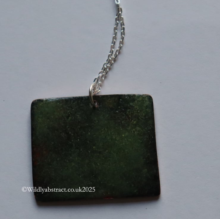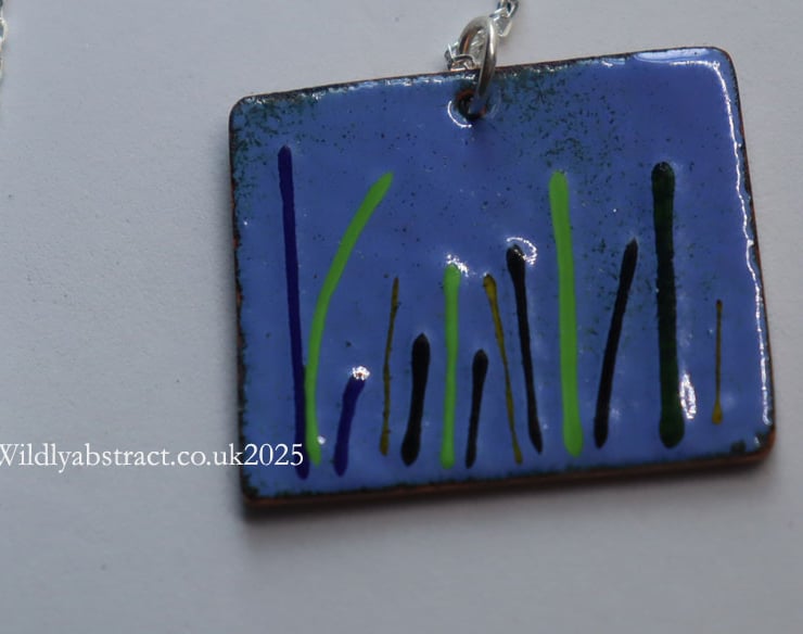 This pendant was hand-crafted from copper sheet. It is coated with pastel blue enamel and counter-enamelled on the reverse. It was then fired and decorated with carefully placed enamel threads and re-fired. The pendant is suspended from a sterling silver trace chain. It measures 3cms x 2.5cms with a total necklace length of 25cms.