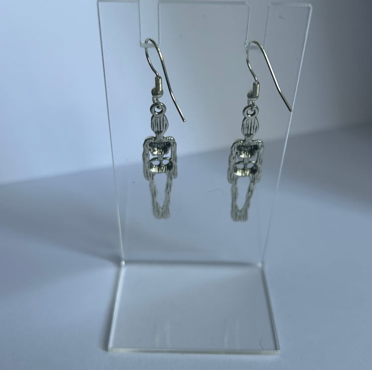 Drop down stainless steel silver skeleton earrings. These funky earrings are perfect for Halloween approaching or just because they different. The earrings come with clear rubber backs.
