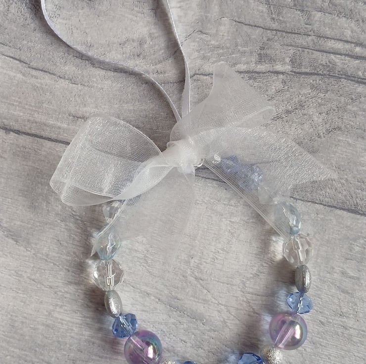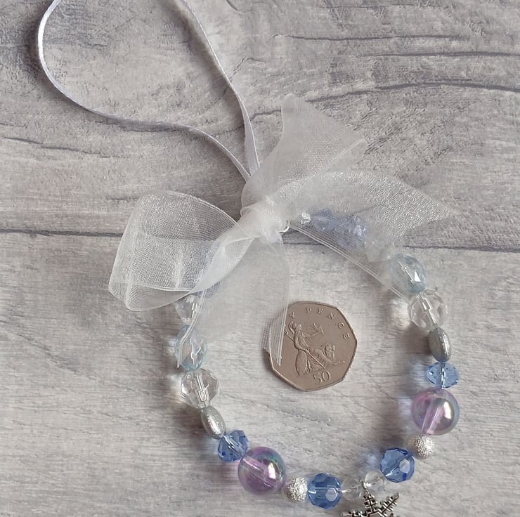 Perfect for a winter themed tree, this beaded decoration has been made from a selection of beads in frosty blues, silver and ice clear, with a snowflake charm at the centre. Strung of silver plated craft wire, the ring is finished with a shimmery white organza bow, and a ribbon hanging loop. The ring is approximately 9 cm in diameter, not including hanging loop or charm.
