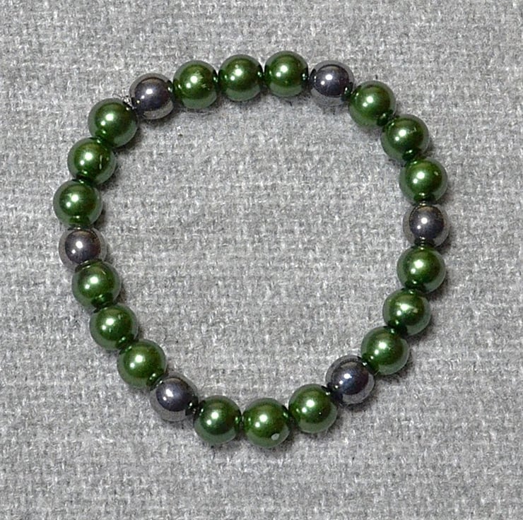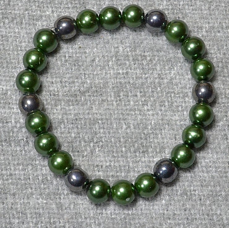 Green Glass Pearl and Gunmetal Glass Bead Elastic Bracelet