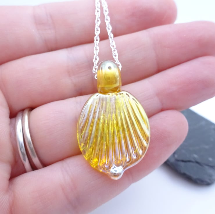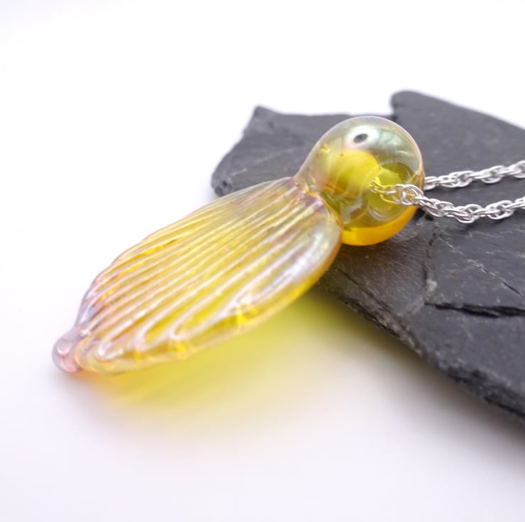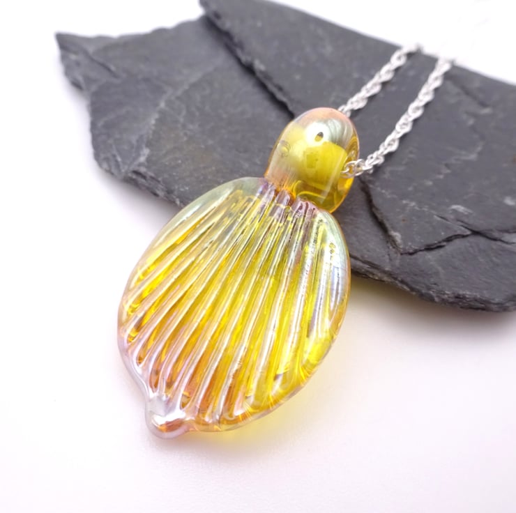 A sterling silver chain strung with a handmade lampwork glass leaf pendant.