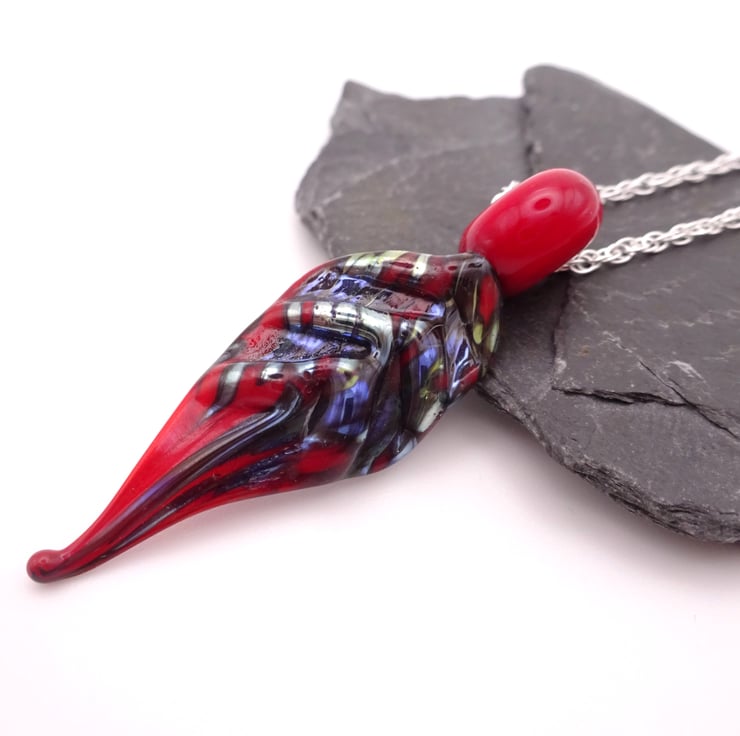 A sterling silver chain strung with a handmade lampwork glass leaf pendant.