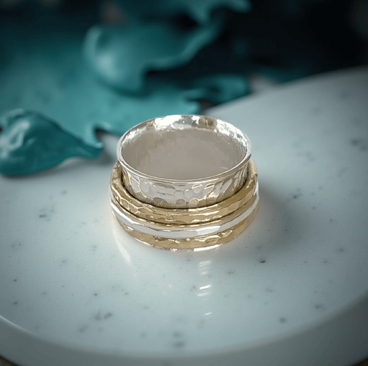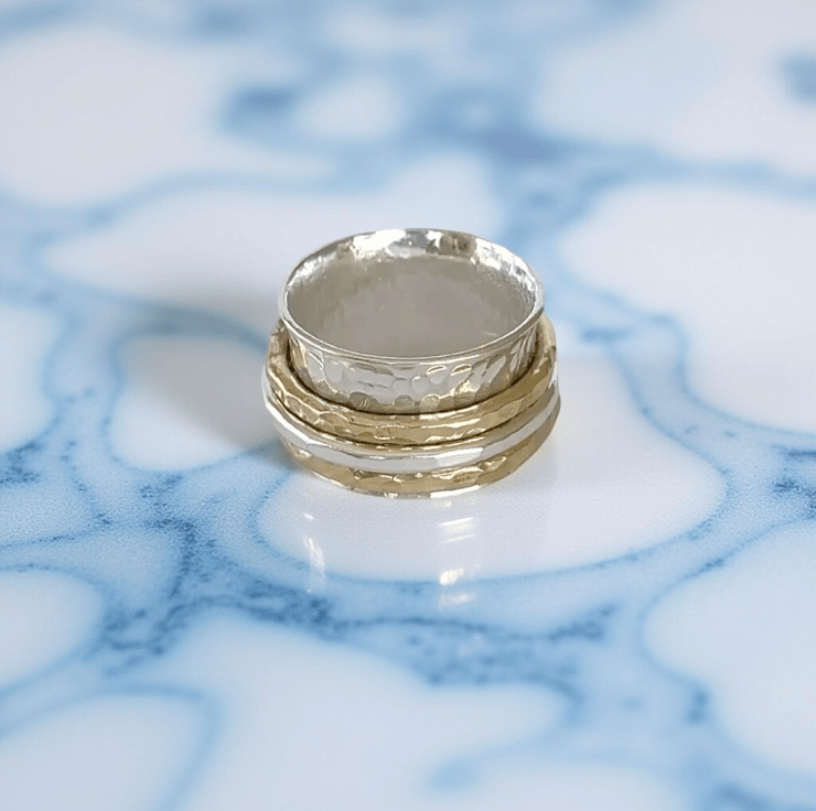 Fall in love with this Artisan spinner ring, handcrafted by silveriness in sterling and a choice of 14k gold-filled. A softly hammered 12mm band with three spinning bands creating movement, comfort, and timeless romance. made to order with sustainable silver, a perfect gift of love and elegance.