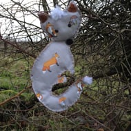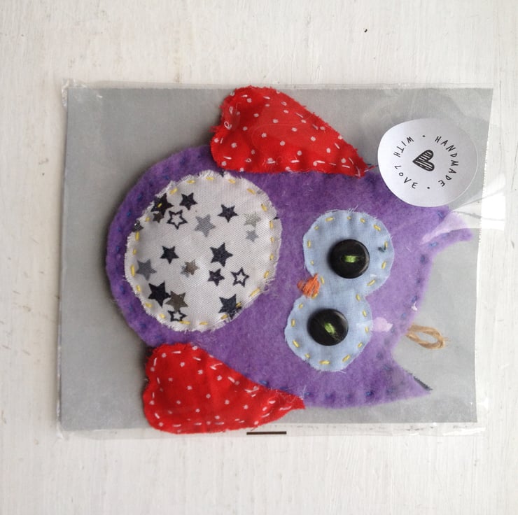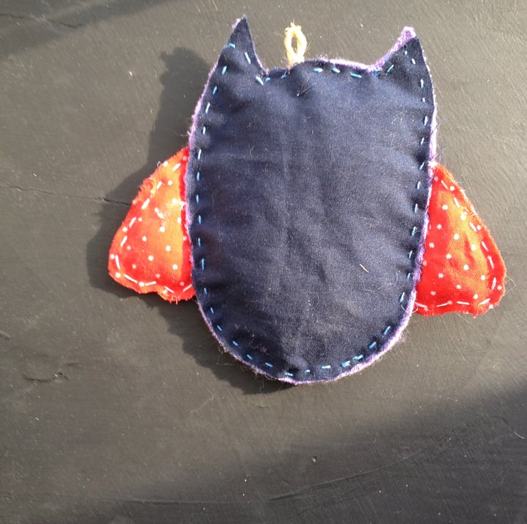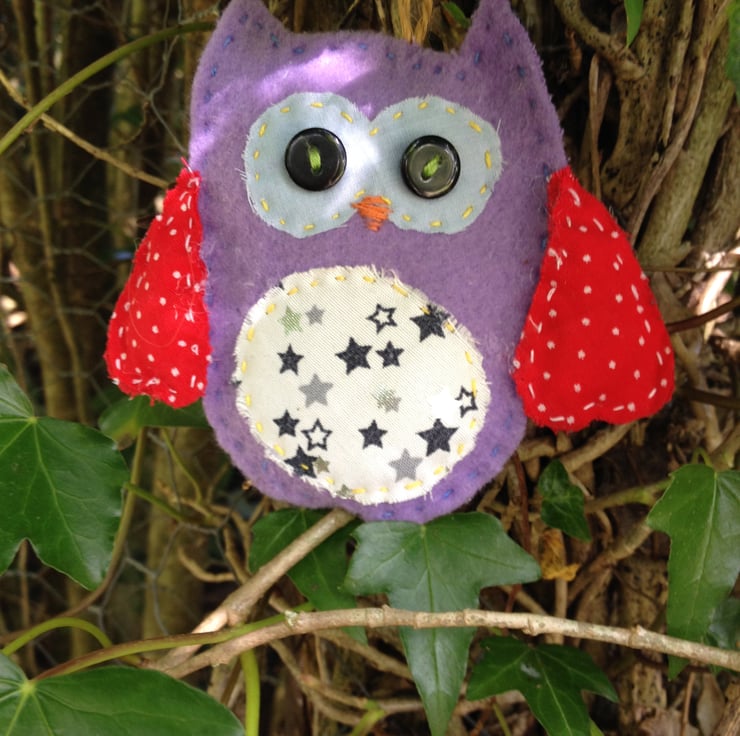 Hand stitched owl, intentionally tatty,, made from scraps, softly padded with button eyes.
