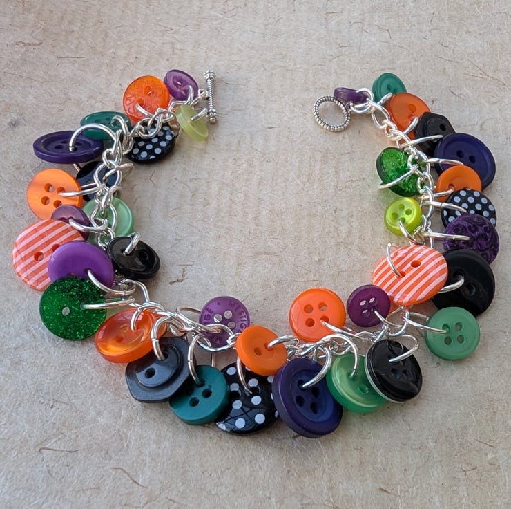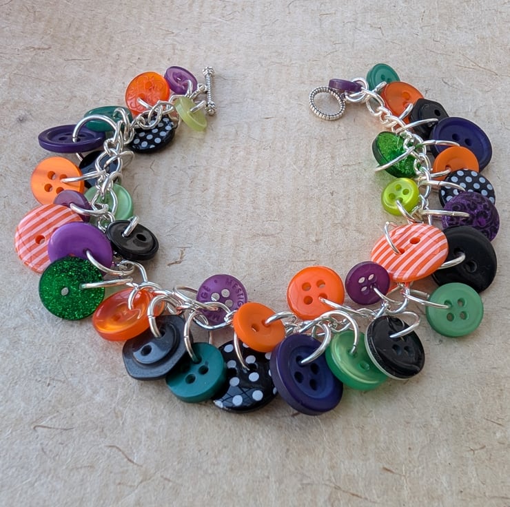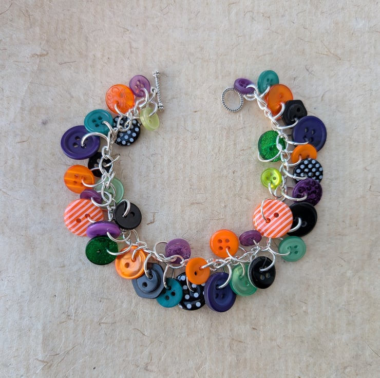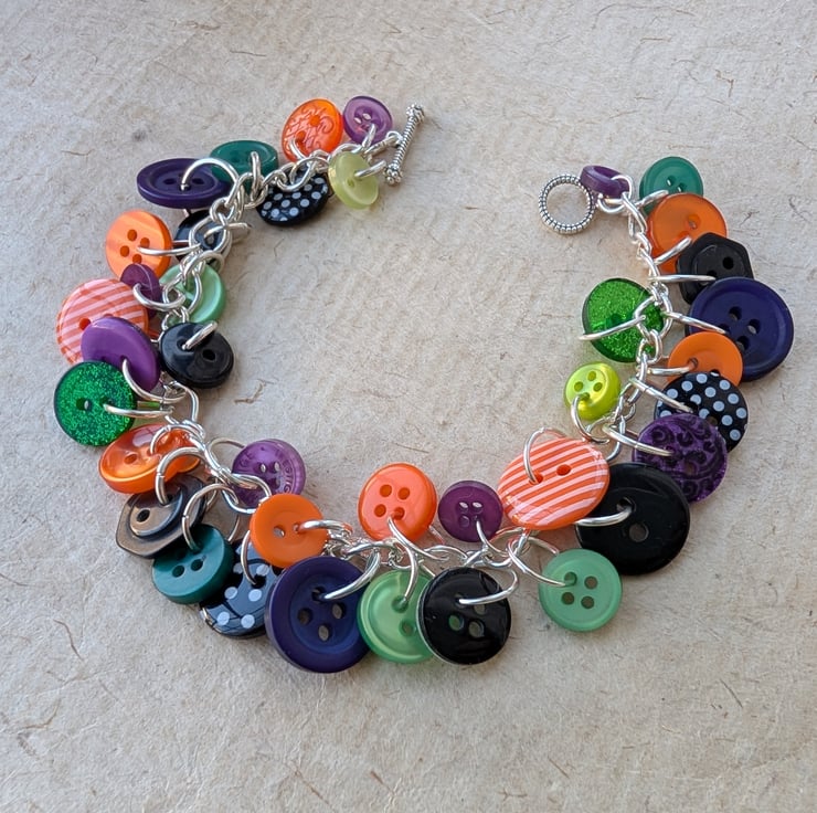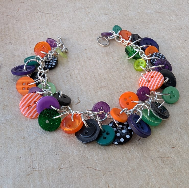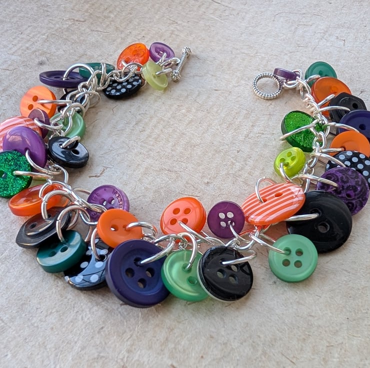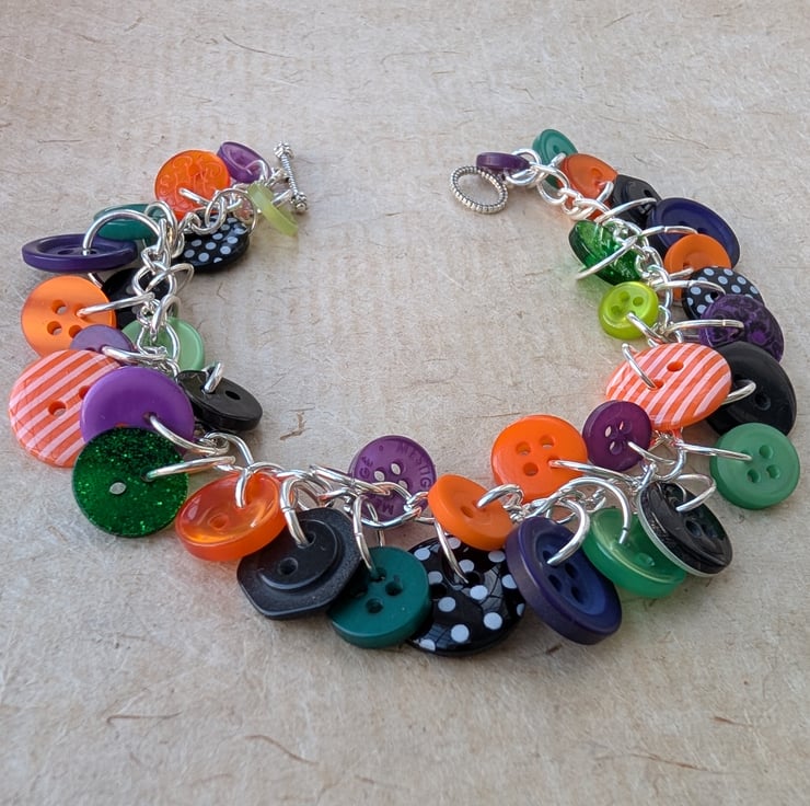 This bracelet features a collection of buttons in the Halloween related colours of purple, green, black and orange. Each button is attached with jump rings to silver plated chain, creating lots of movement when worn.