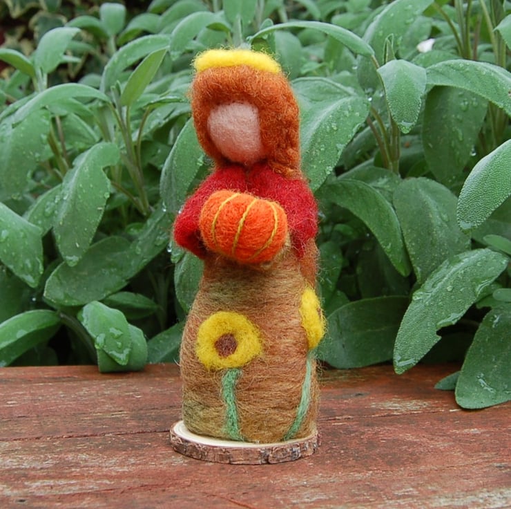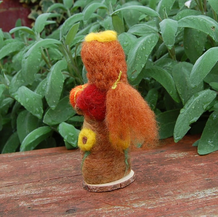 Her solid body is made from wool core needle felted into a shape. Soft unspun wool fibres in Autumn shades have been needle felted for her dress. She is attached to a wood slice.