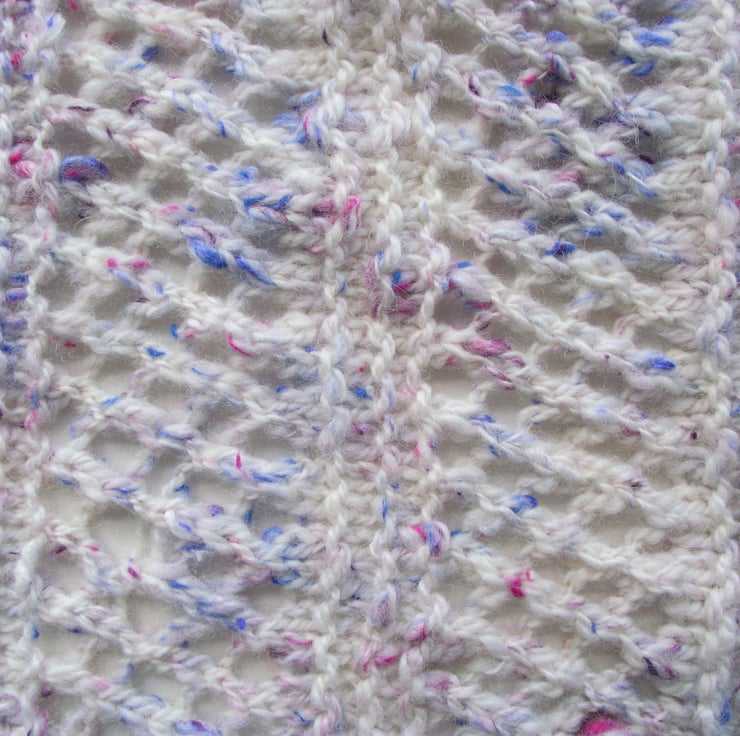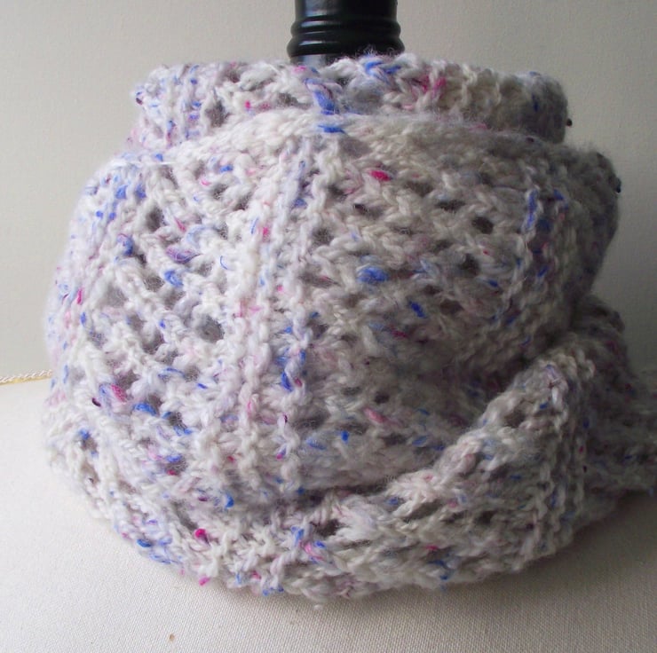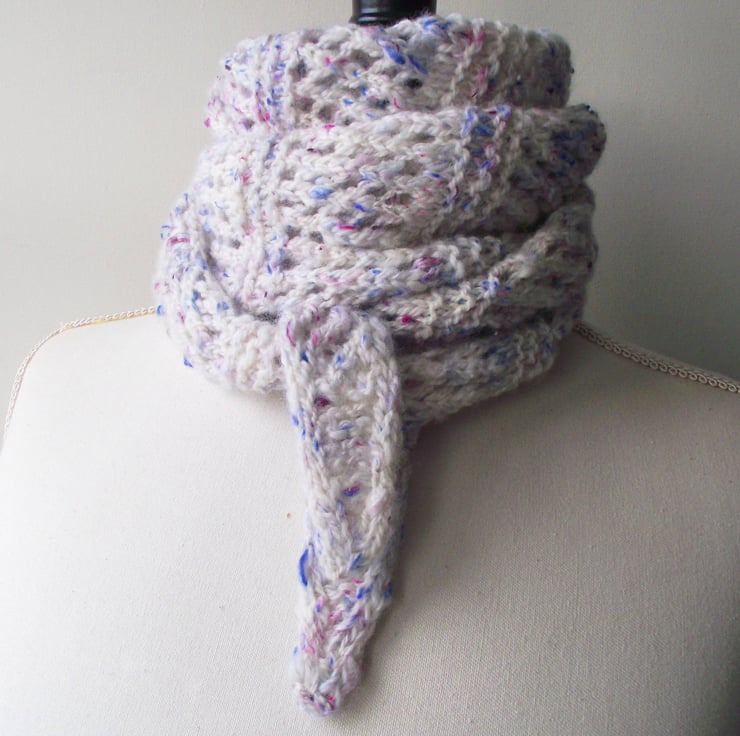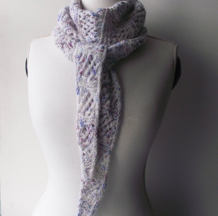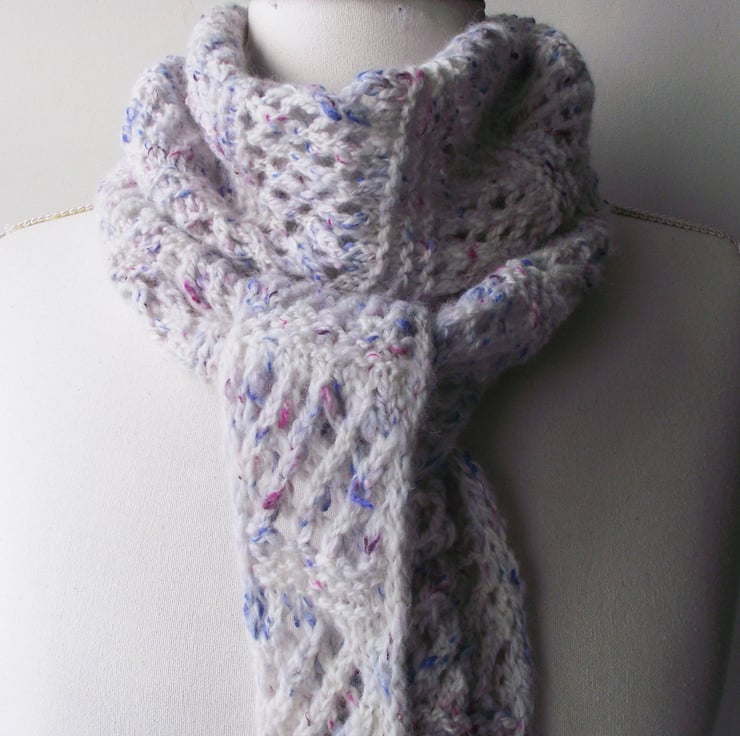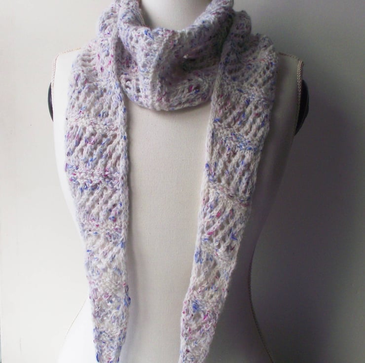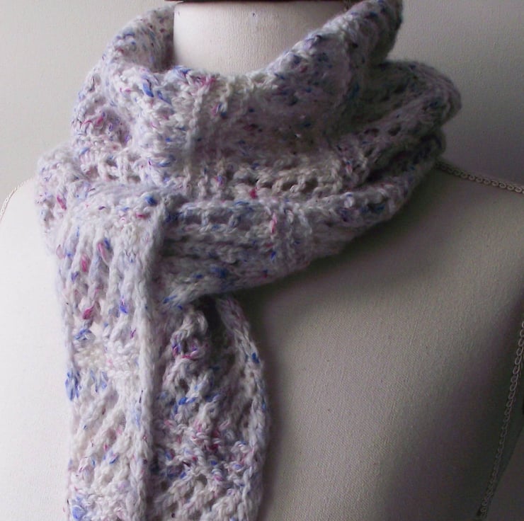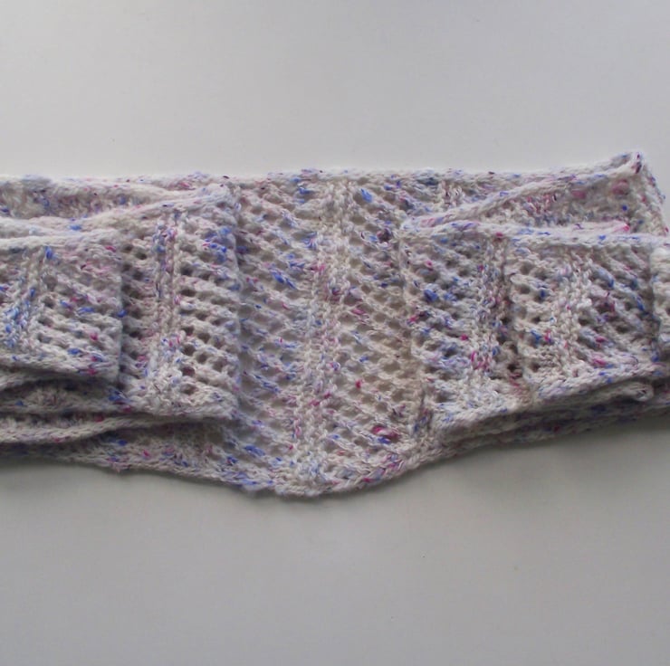 I handspun a beautifully soft Polwarth wool, blended with viscose nepps in pink and blue into a medium weight yarn, then knitted this scarf to my own design.