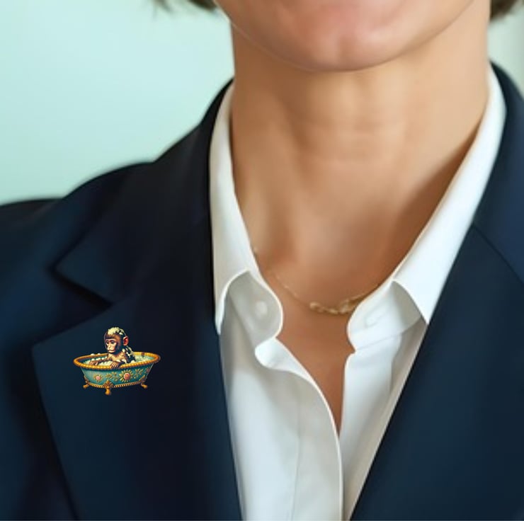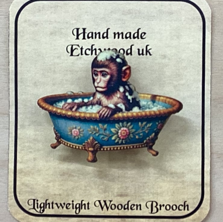 A laser cut wooden brooch with a graphic featuring aa little monkey taking a bath.