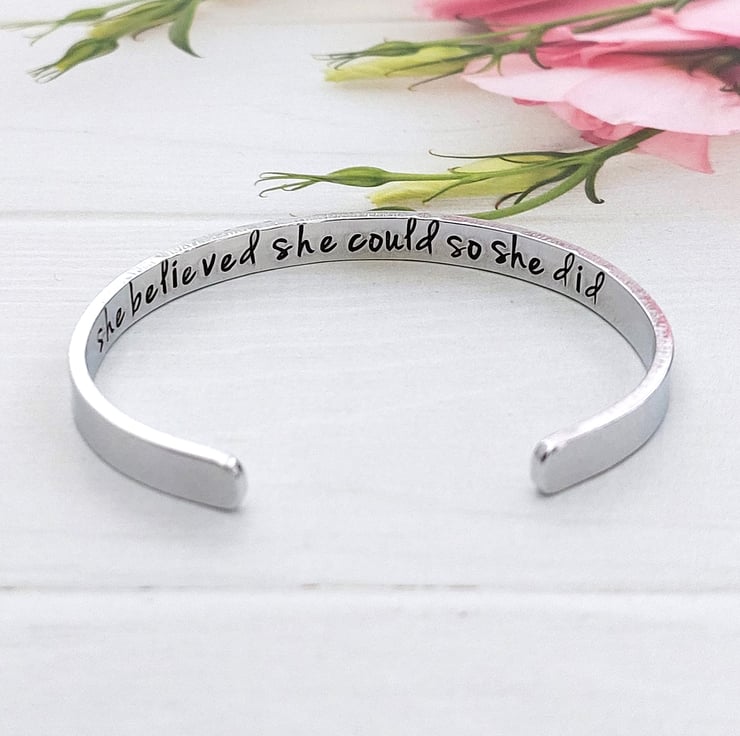 A 6mm adjustable aluminium cuff bracelet hand stamped with the motivational phrase 'she believed she could so she did'.