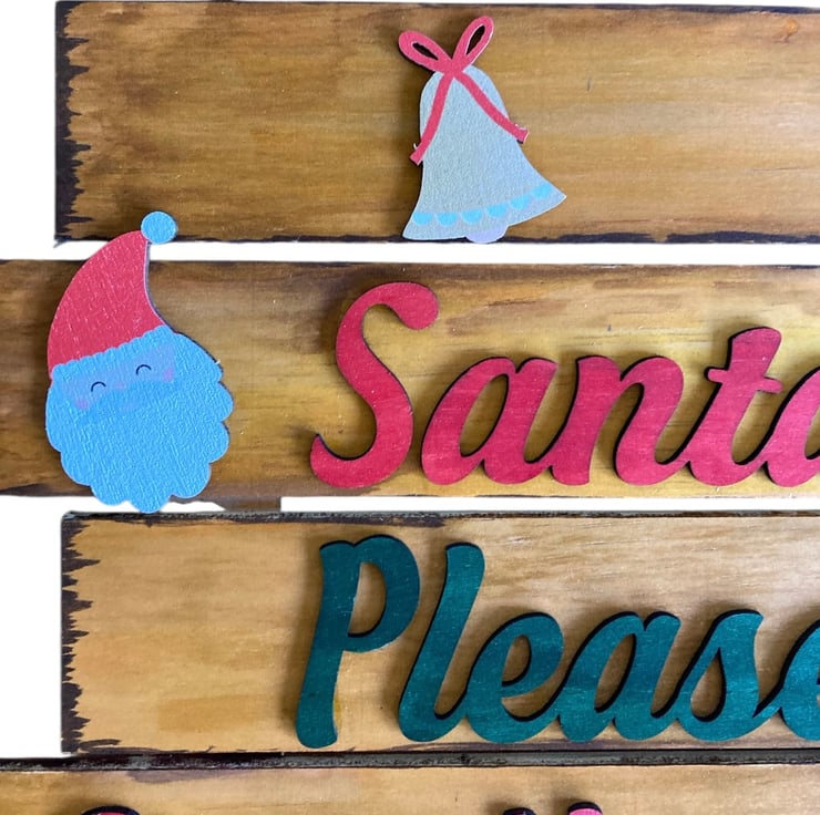 “Santa Please Stop Here” has been laser cut and hand decorated.