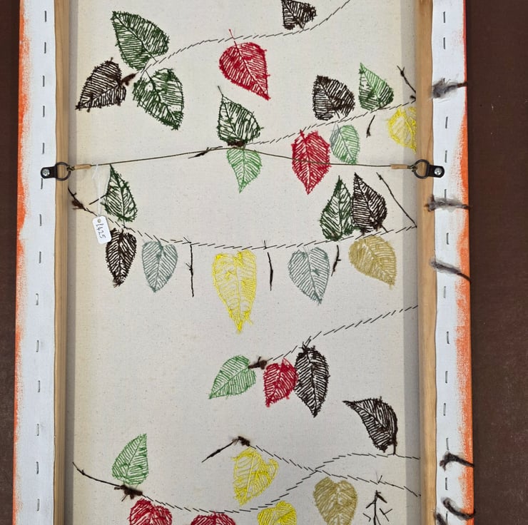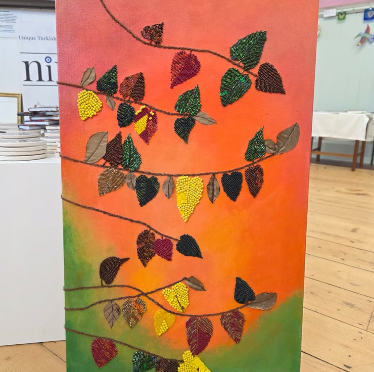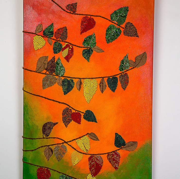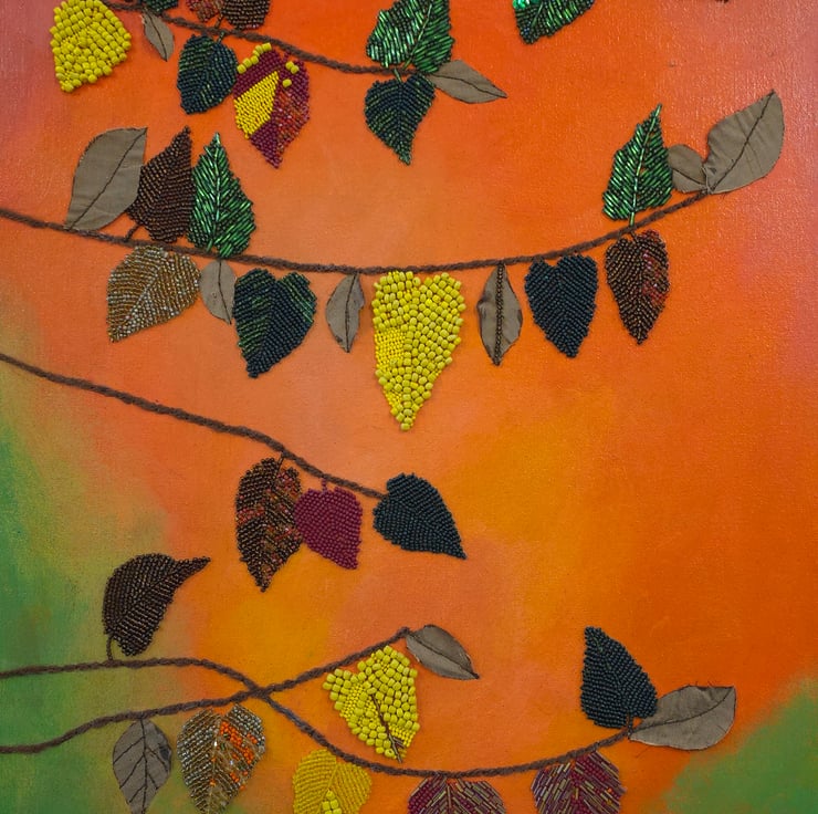 This original piece is hand-painted in rich acrylics, with a tapestry of bead-embroidered leaves that shimmer softly, catching the light like fallen dew. A scattering of sequins adds a subtle sparkle, while carefully stitched brown fabric leaves provide a lovely earthy contrast. The tree branches—delicately couched using fine brown yarn—wind their way across the canvas and even wrap around the edges, giving the artwork a sense of quiet movement and organic flow.