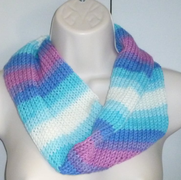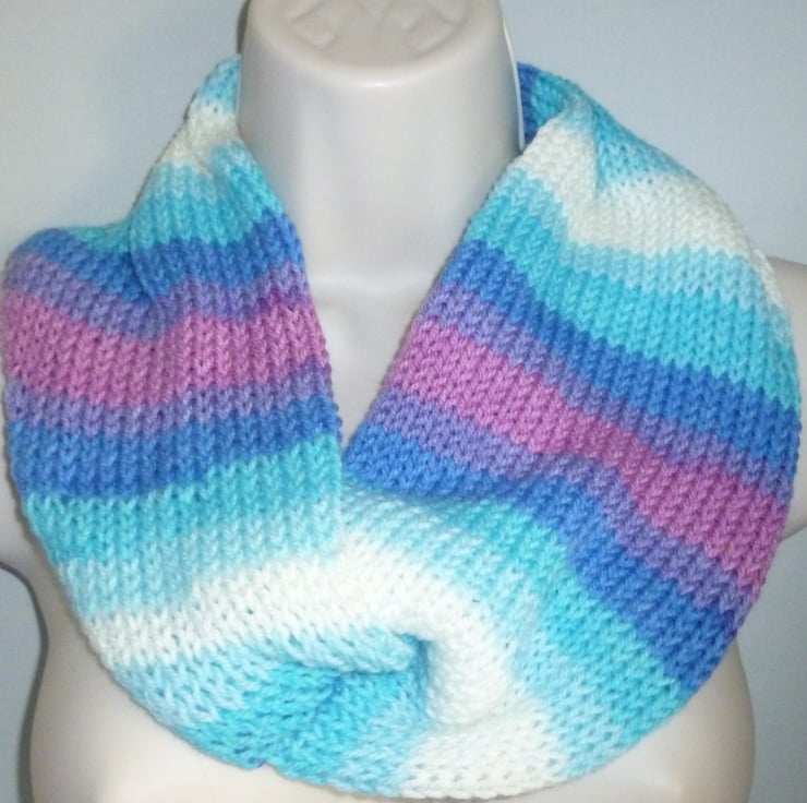 This pretty knitted infinity scarf has been made using a lovely soft multicoloured acrylic yarn