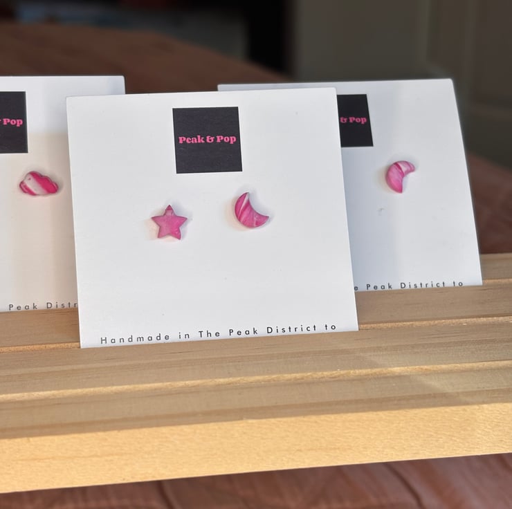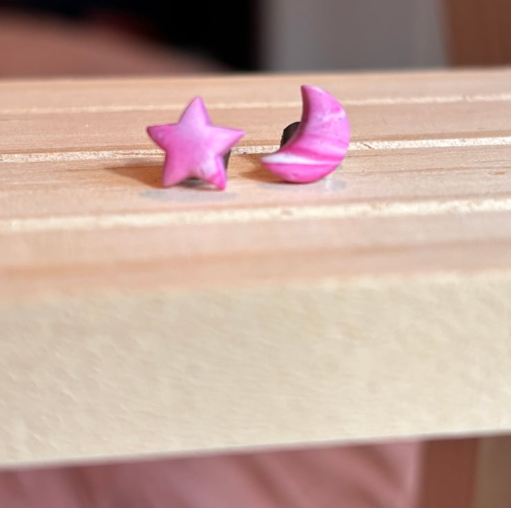 Made from mixed pink and white clay. The star measures 7mm and moon is 4mm wide and 7 mm long approximately.