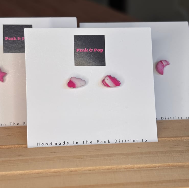 I make all of my jewellery from my home studio. I made this pink collection of moons, stars and clouds just after my daughter had her own ears pierced, originally with something in mind that she would love. She did and I was soon making them for her friends too! However, I was surprised when in the end I was selling more of these to the grown ups!
