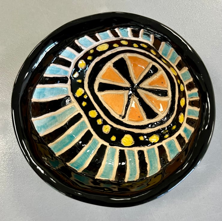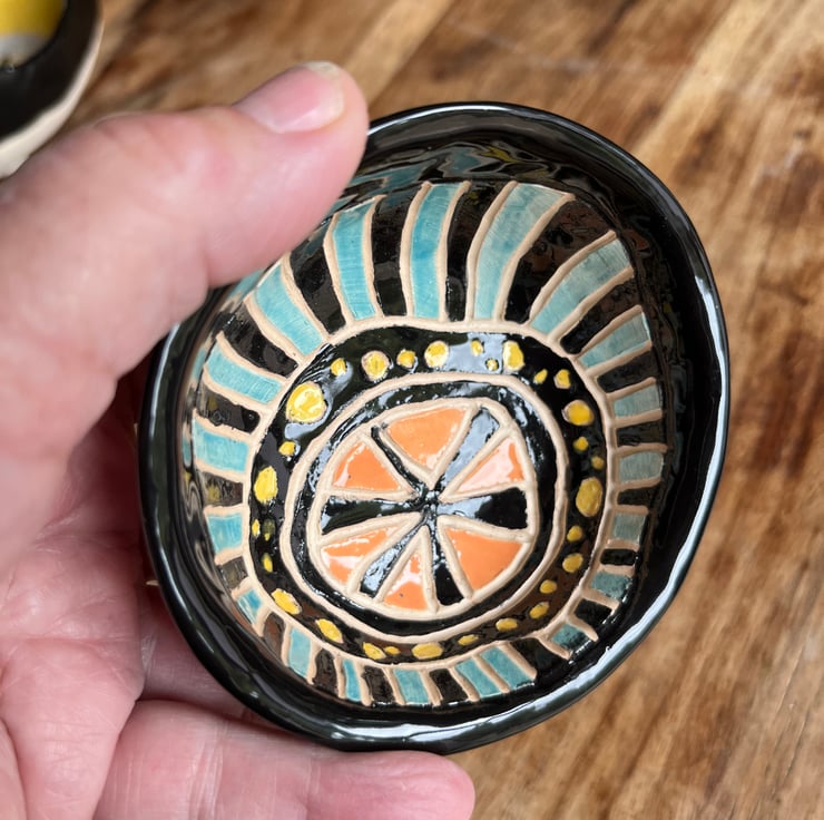 This bright and colourful little handmade bowl will look fabulous on your bedside table for your rings and things.