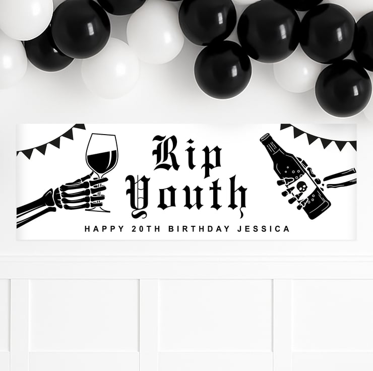 Add humour and edge to milestone birthdays with this RIP Youth personalised banner. Featuring gothic-style text and skeleton hands holding drinks, it’s ideal for 18th, 21st and 30th birthdays with a fun twist. Customise with any name and age.