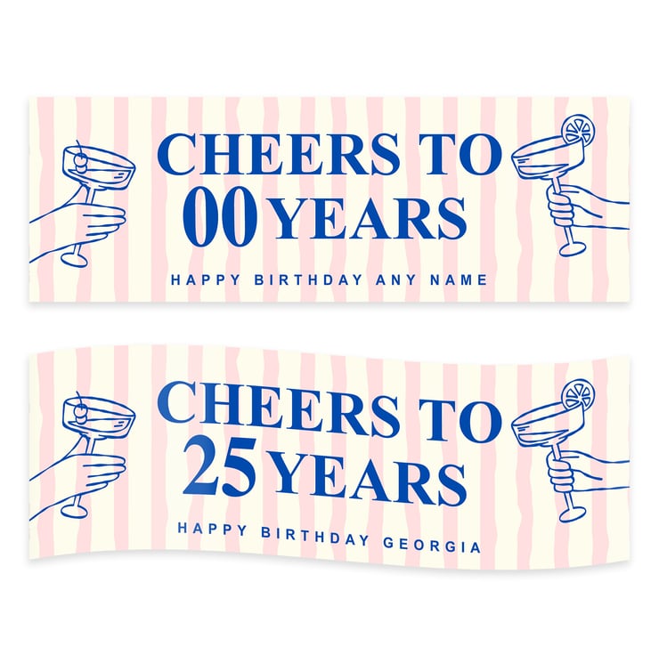 Add colour and fun with this Cheers to Years striped banner featuring pink and cream stripes and cocktail glass illustrations. Perfect for birthdays with a cocktail theme. Personalise with any age and name for a vibrant party decoration.