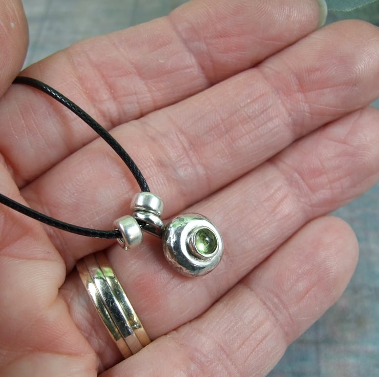 I have created the pebble from molten sterling silver, heated to melting point where it forms a small pebble, then hammered to flatten and added a cup to hold the 3mm peridot gemstone. This is paired with silver beads and suspended from 1mm black waxed cord which I have fitted with a sliding silver clasp. Small silver beads have been added to the end of the cord. Necklace is put on over the head and can be worn at any length to 30 inches or wrapped around your wrist to wear as a bracelet.