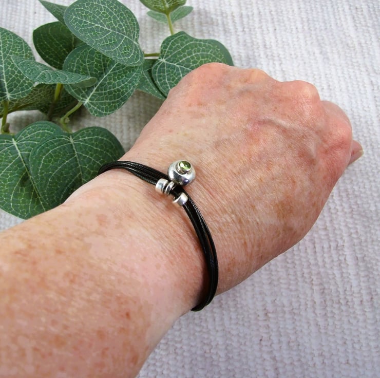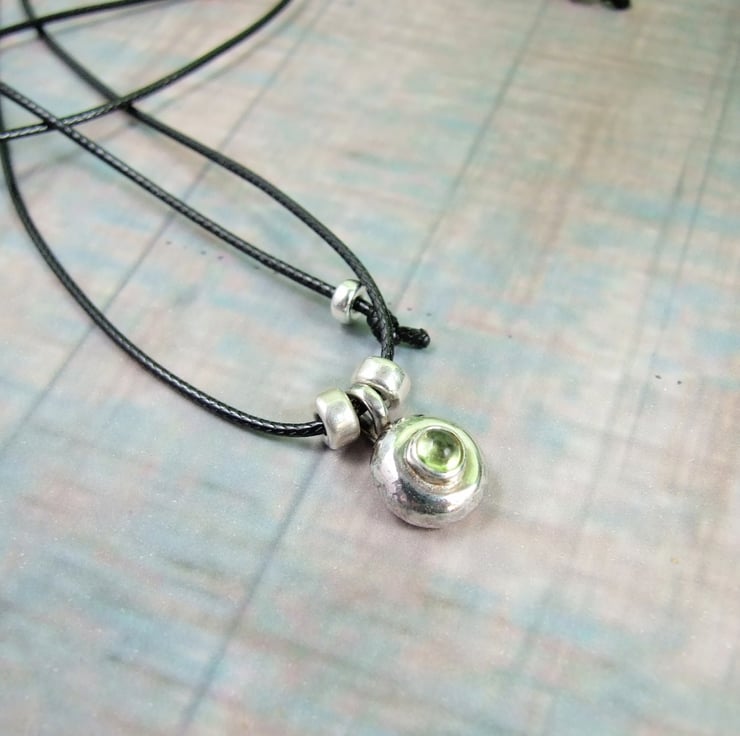 Silver Pebble Necklace set with Peridot Gemstone on an adjustable wax cord, with sterling silver sliding clasp. Can also be worn as a wrap bracelet