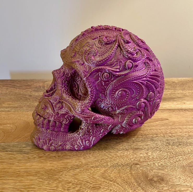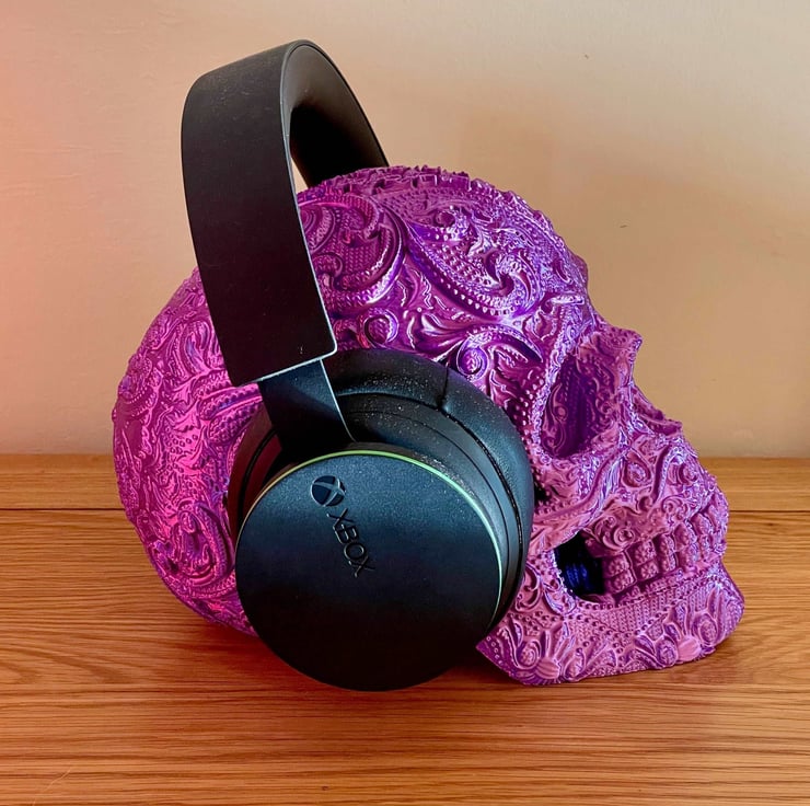 Show off your edgy music style with this Sugar Skull Headphone Stand! Perfect for any music lover, gamer, or collector, this striking stand is both practical and stylish. Crafted from durable 3D printed material, it keeps your headphones safe while adding a bold focal point to your desk, studio, or office.