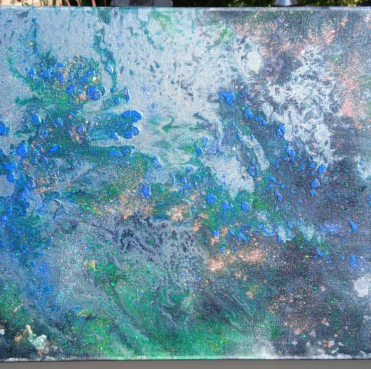 Iridescent Abstract paint pour painting on canvas with beautiful iridescent shimmer created by very fine mica powder & glitter to give the overall look & feel of the night sky.