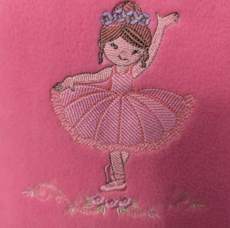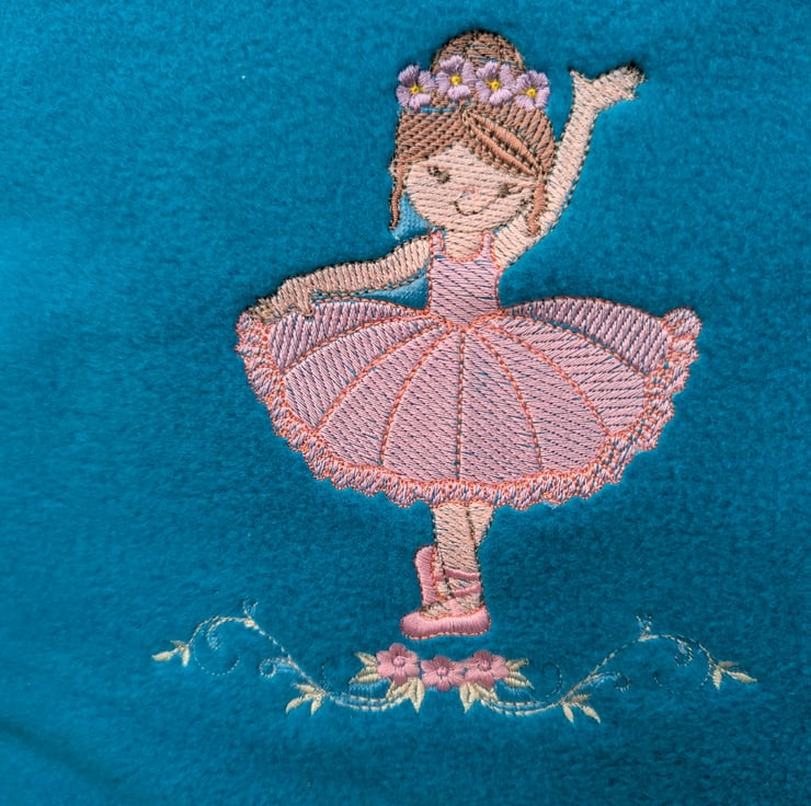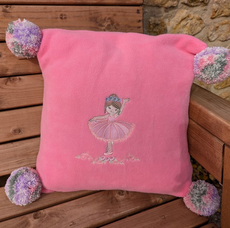 16" square fleece cushion, with an adorable embroidered posing ballerina. Hand made pom poms at each corner. Cushion pad included in price. Envelope style backing, so there is no need for a zip. Colour may vary slightly from the picture. Currently available in pink and turquoise, but cushion cover can be made in most popular colours. An ideal gift for any aspiring Darcey Bussell.