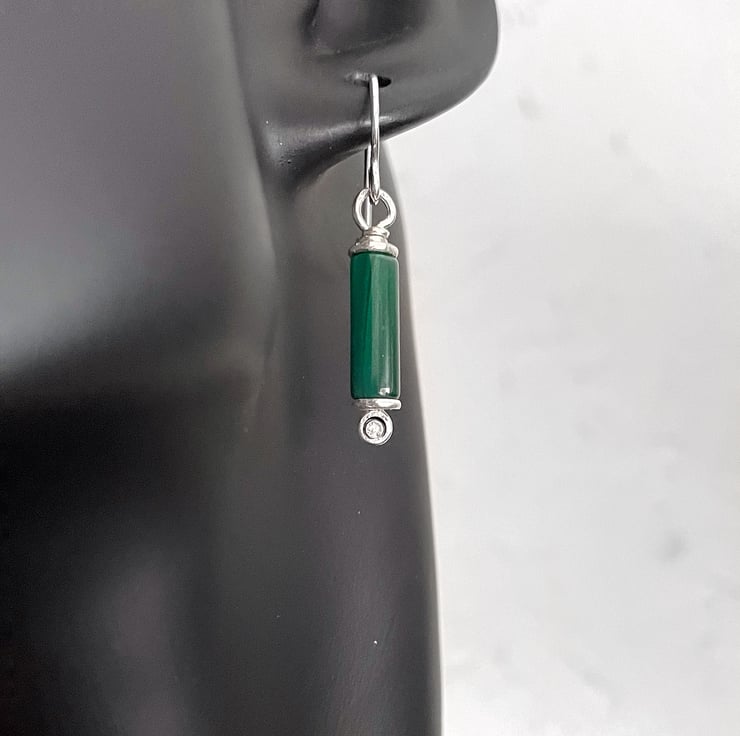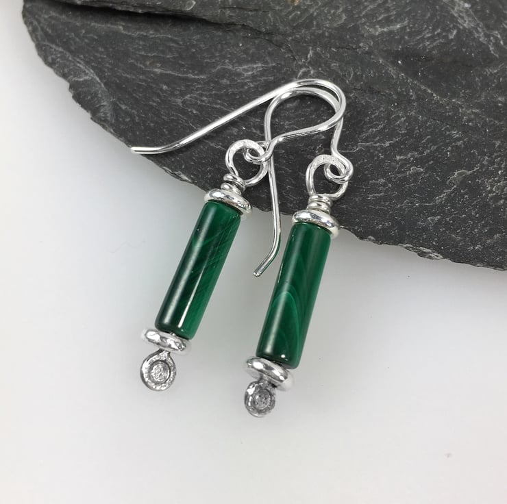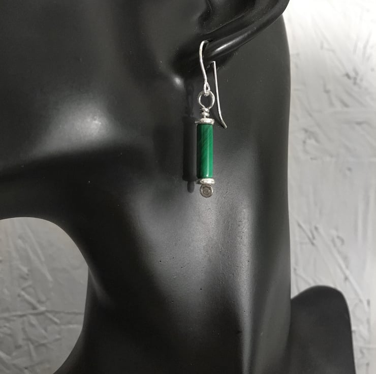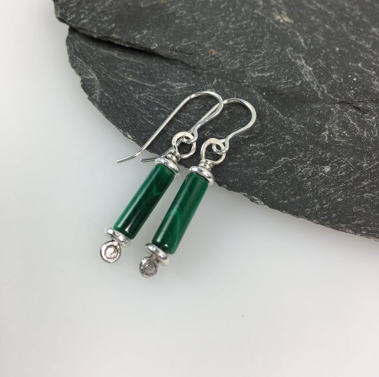 Forged sterling silver pins have been threaded through silver washer beads and shiny green malachite tubes.