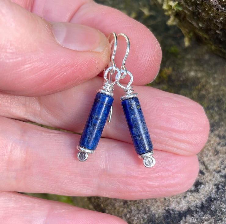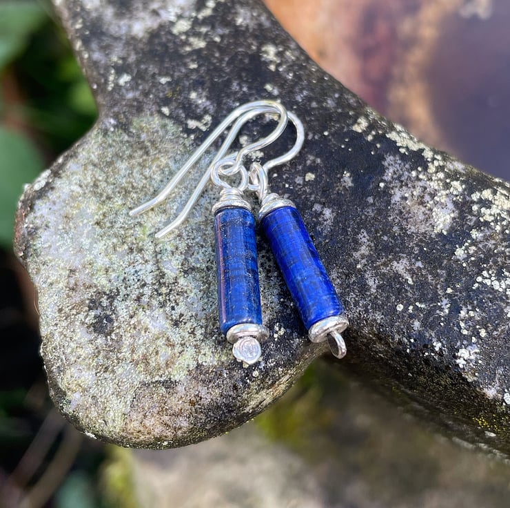 Forged sterling silver pins have been threaded through silver washer beads and rich blue lapis lazuli tubes.