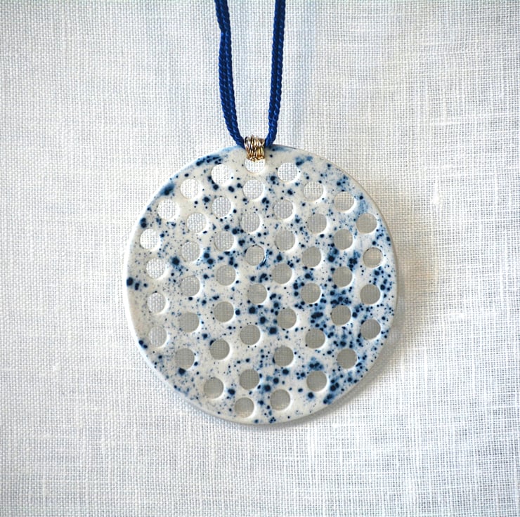 The pendant idea was sketched and developed in the craft studio using the simplicity of a circle with detail added including the blue flecks of powdered stain embedded into the porcelain before firing and gold colour plated wire connecting the pendant to the silk cord. The decorative holes are also functional enabling the ceramic pendant to be connected to the silk cord using the wire. The pendant measures 7cms across.