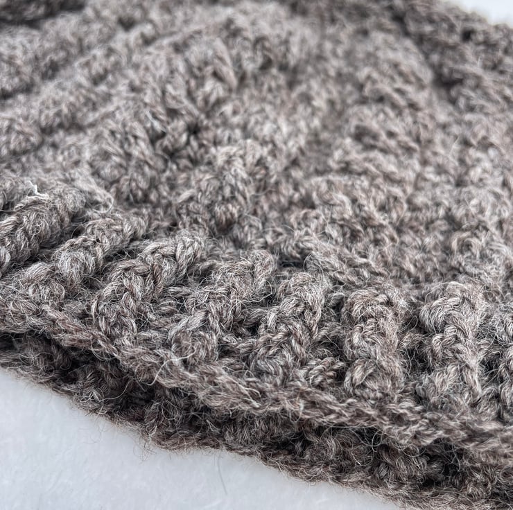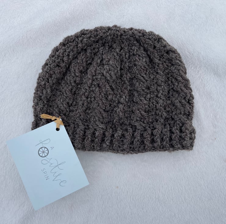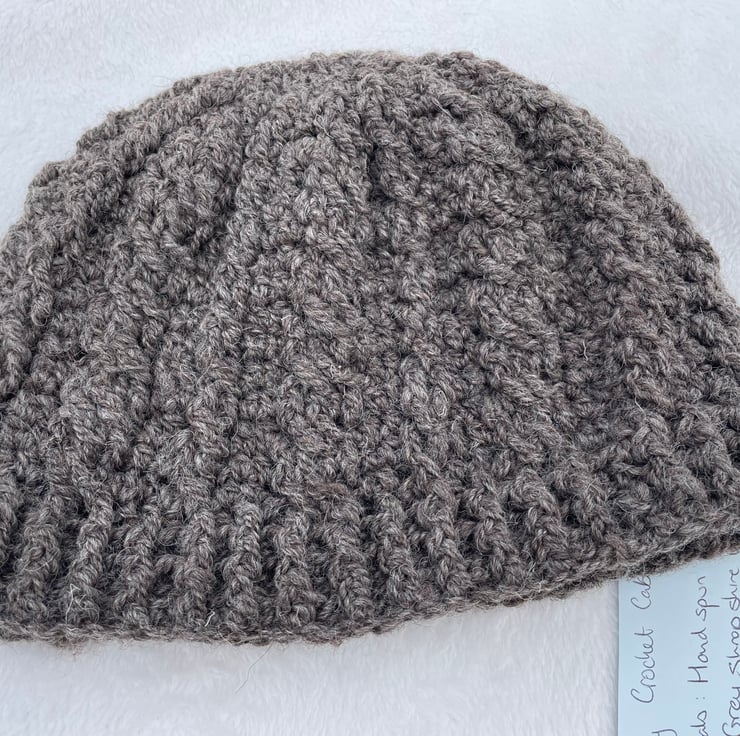 This hat has a raised cable pattern and has been crochet using dark grey Shropshire wool that I hand spun.