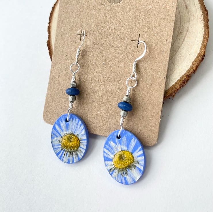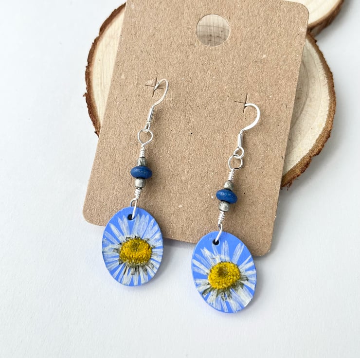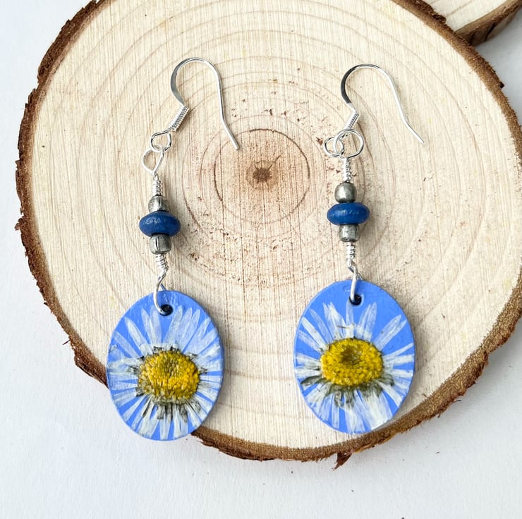 These lovingly handmade dangle earrings are made using hand painted wooden ovals with real pressed daisy foraged within a mile from our home. Finished with a water based varnish.