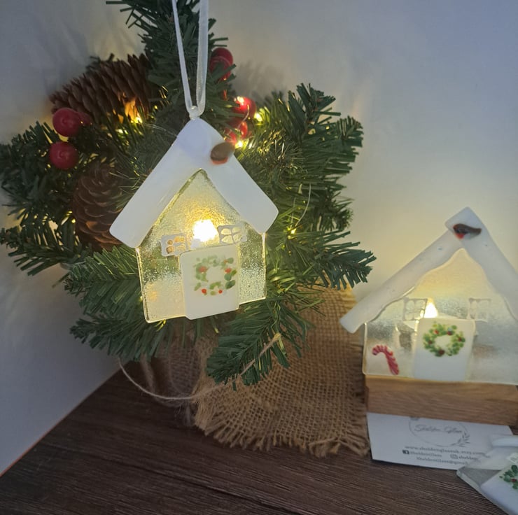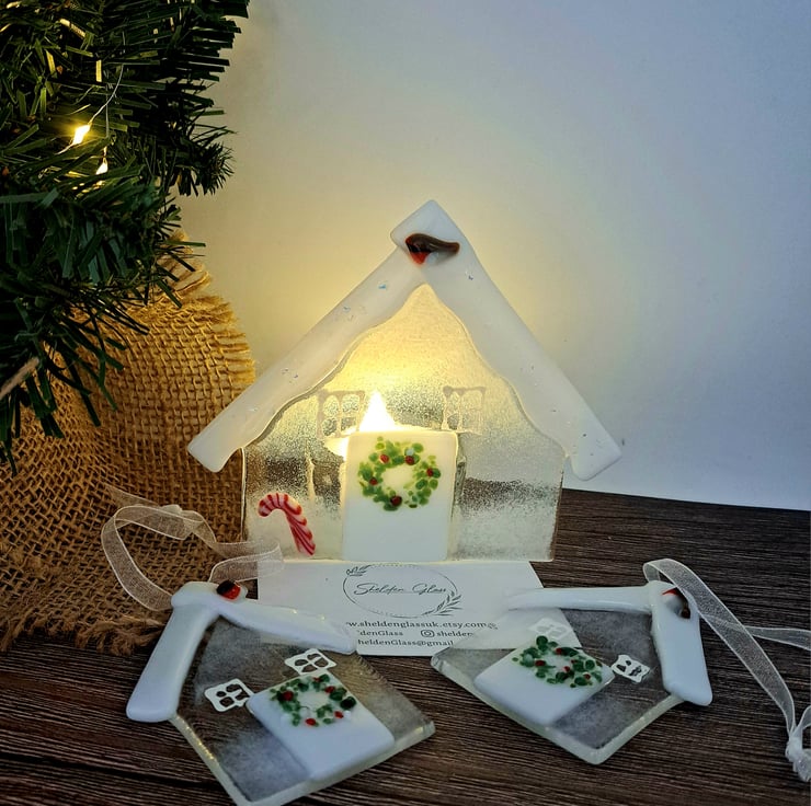 Cut by hand they are approx 5 to 6 cm widecand 7 to 8cm high. Using white glass for the roof, enalels to hand drawn the windows and white glass powder to create the snowy effect. A wreath on the door and a robin on the roof complete the look. Its then fired in the kiln at 745°C for around 12 hours before a white ribbon is added.