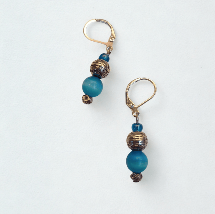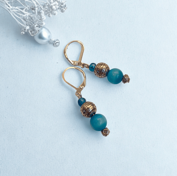 Gorgeous turquoise blue summer sky coloured glass beads. Blended with round Tibetan silver beads & tiny glass & Tibetan silver beads. Hanging on 24 carat gold plated lever back hooks.