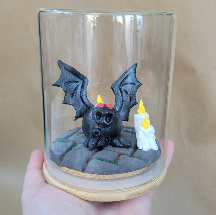 This super cute bat appears to be standing on a creepy castle floor, or maybe in a dank dungeon, the choice is yours. Is it Dracula, in bat form, just returned from a night on the town... Either way this adorable little guy is a handmade unique ornament that will look great in any setting all year around.