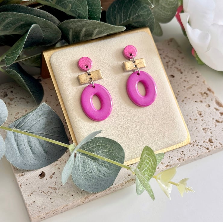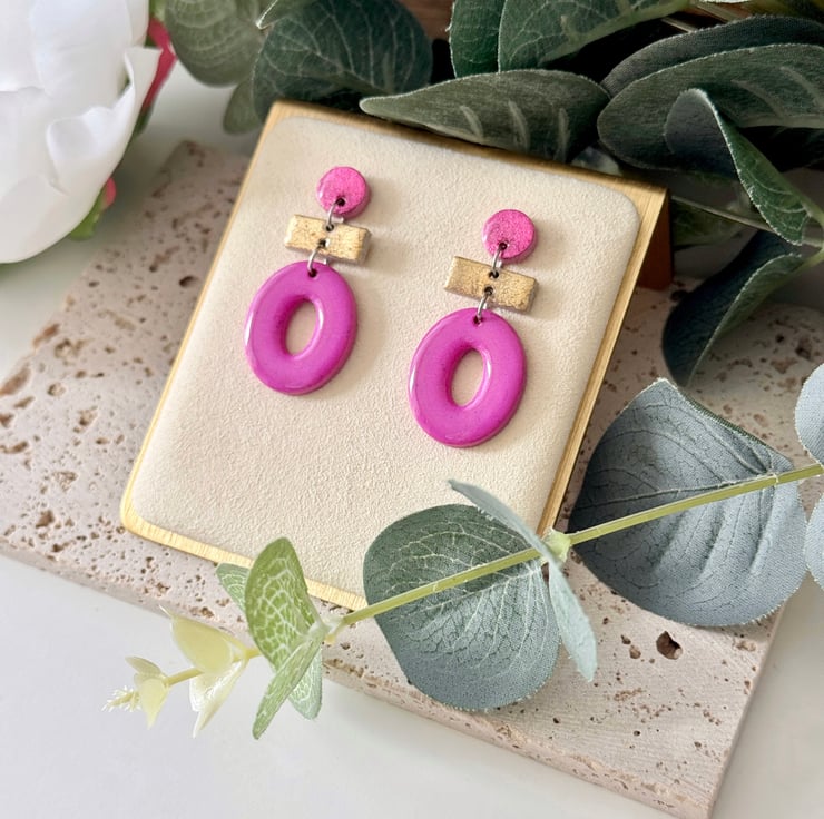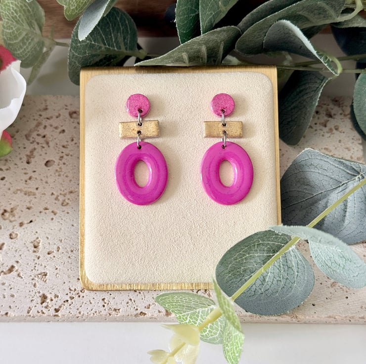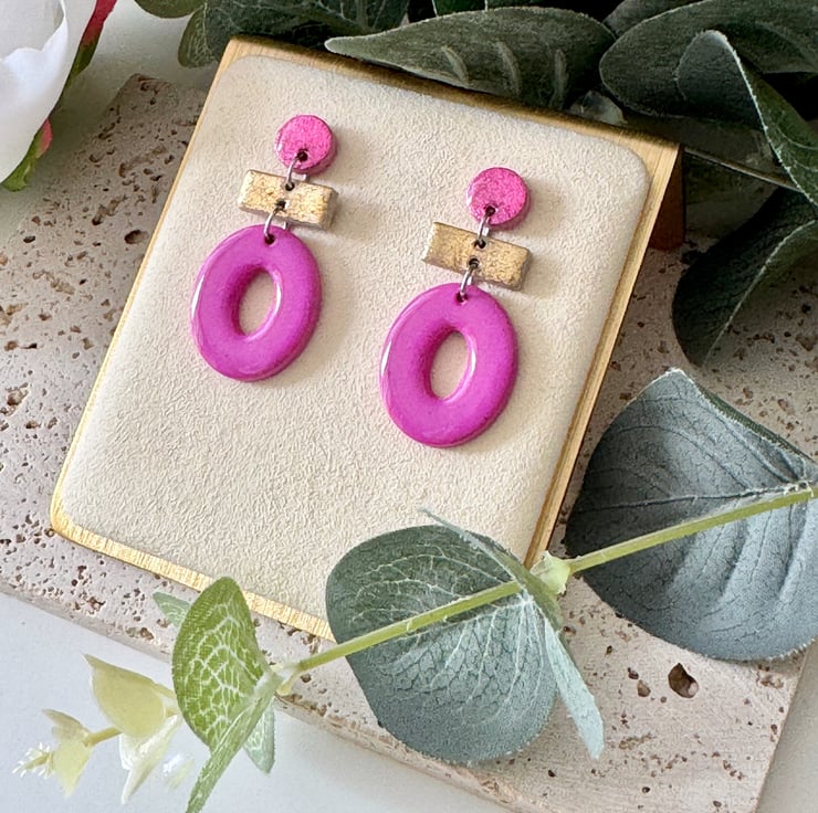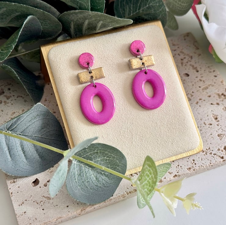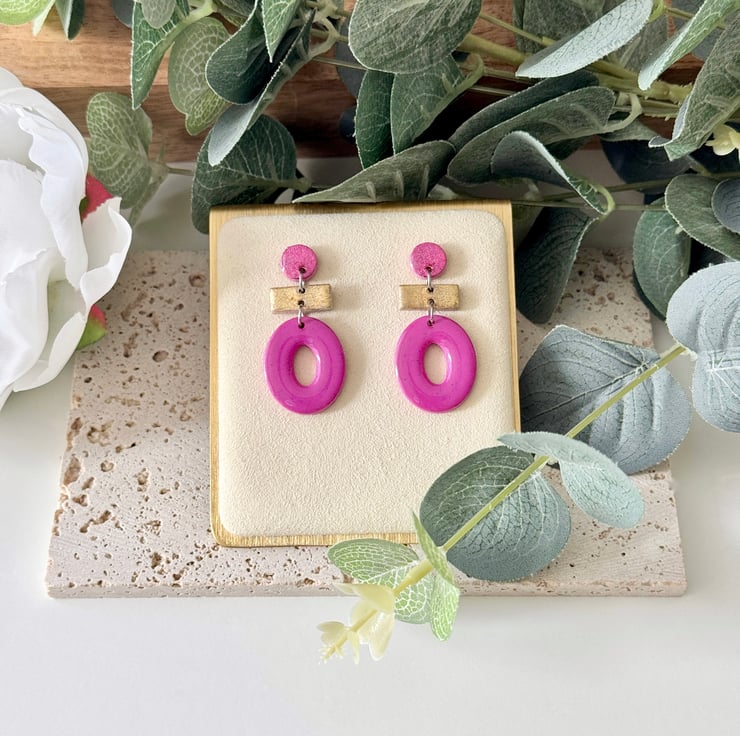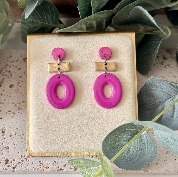 Adjoining to a luscious Pink Polymer Clay and Mica mix, gifting a shimmer Pink with depth, in an Oval hoop shape and a glossy colour enhancing finish that makes them Pop.